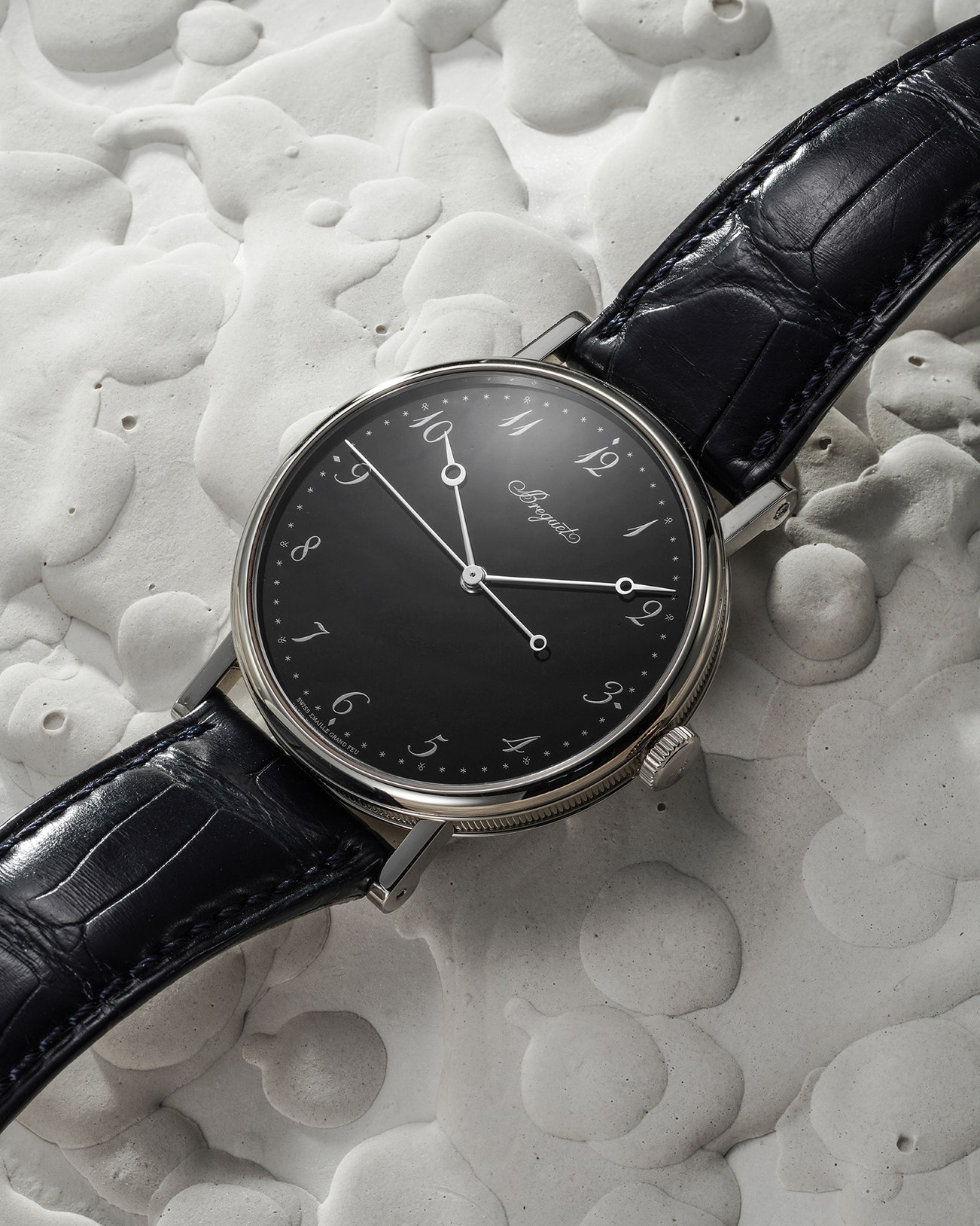 - The watch is presented in a 38mm diameter white gold case with Breguet's iconic coin-edged case. Furthermore, traditional design codes such as the Breguet hands are present. Most importantly, the Breguet “secret signature” is engraved on the Grand Feu enamel dial, which can be seen against incident light.