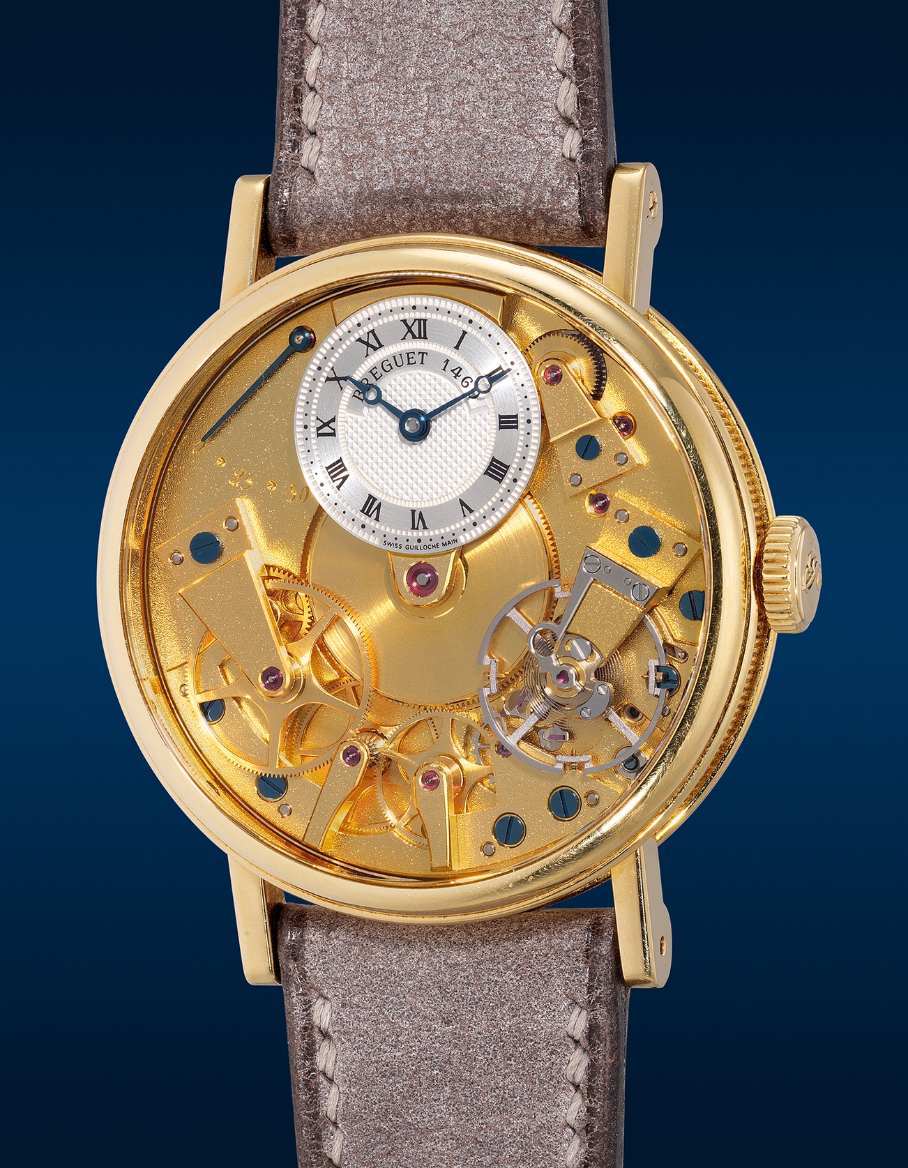 - Inspired by Breguet's 18th-century pocket watches, a particularly fascinating aspect of this timepiece is the placement of the movement's balance wheel. Traditionally situated on the back of the baseplate, it is now proudly showcased on the dial side. This arrangement allows the wearer to admire the intricate gear trains and the captivating inner workings of the movement.