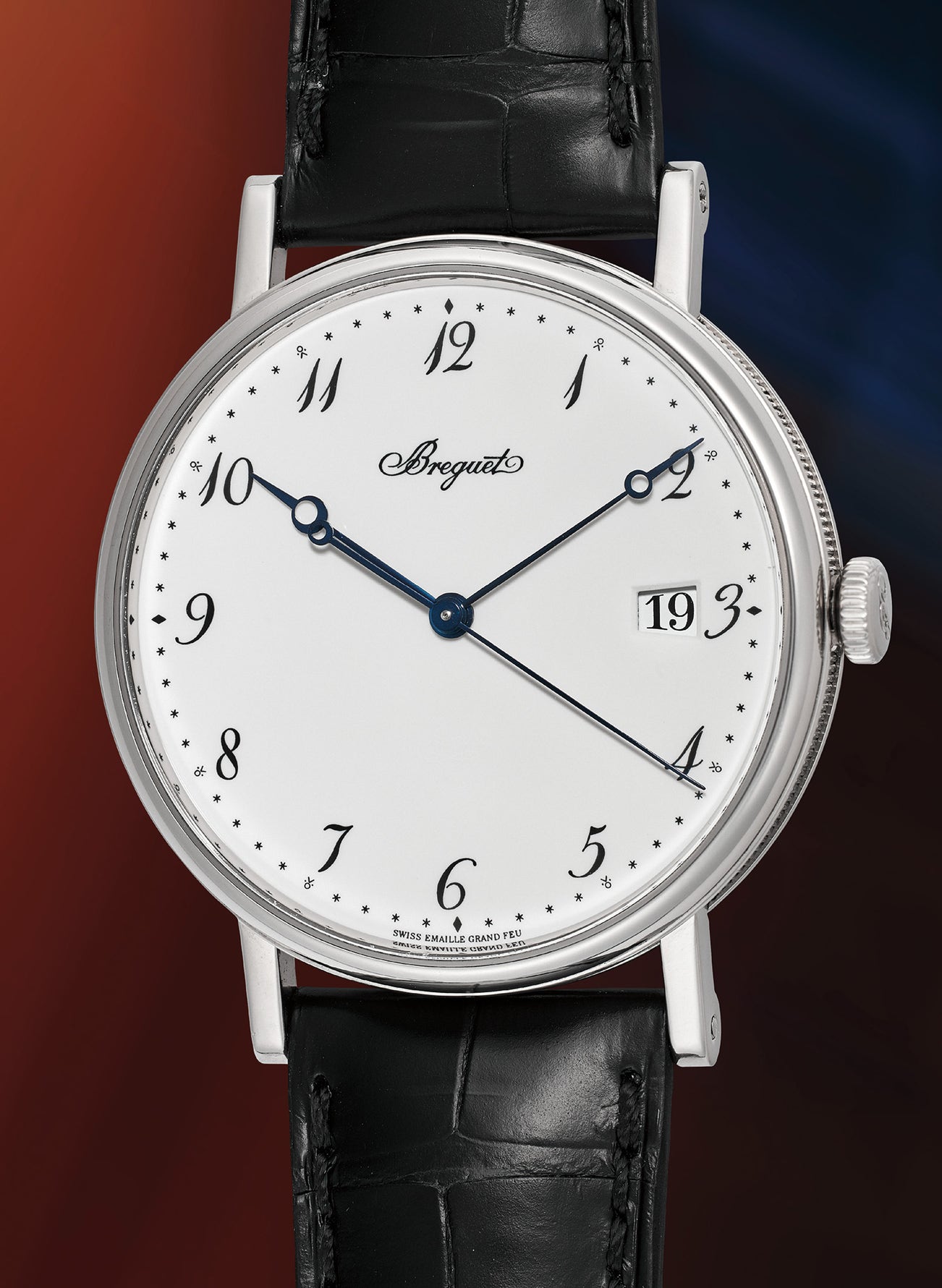 The reference is offered today in pink gold, yellow gold, and white gold like the present model, and all are fitted with the automatic caliber 777Q featuring a white gold oscillating weight with guilloché finish, another hallmark of Breguet’s masterful skill. This example is in excellent overall condition and accompanied by its certificate, presentation and hang tag.