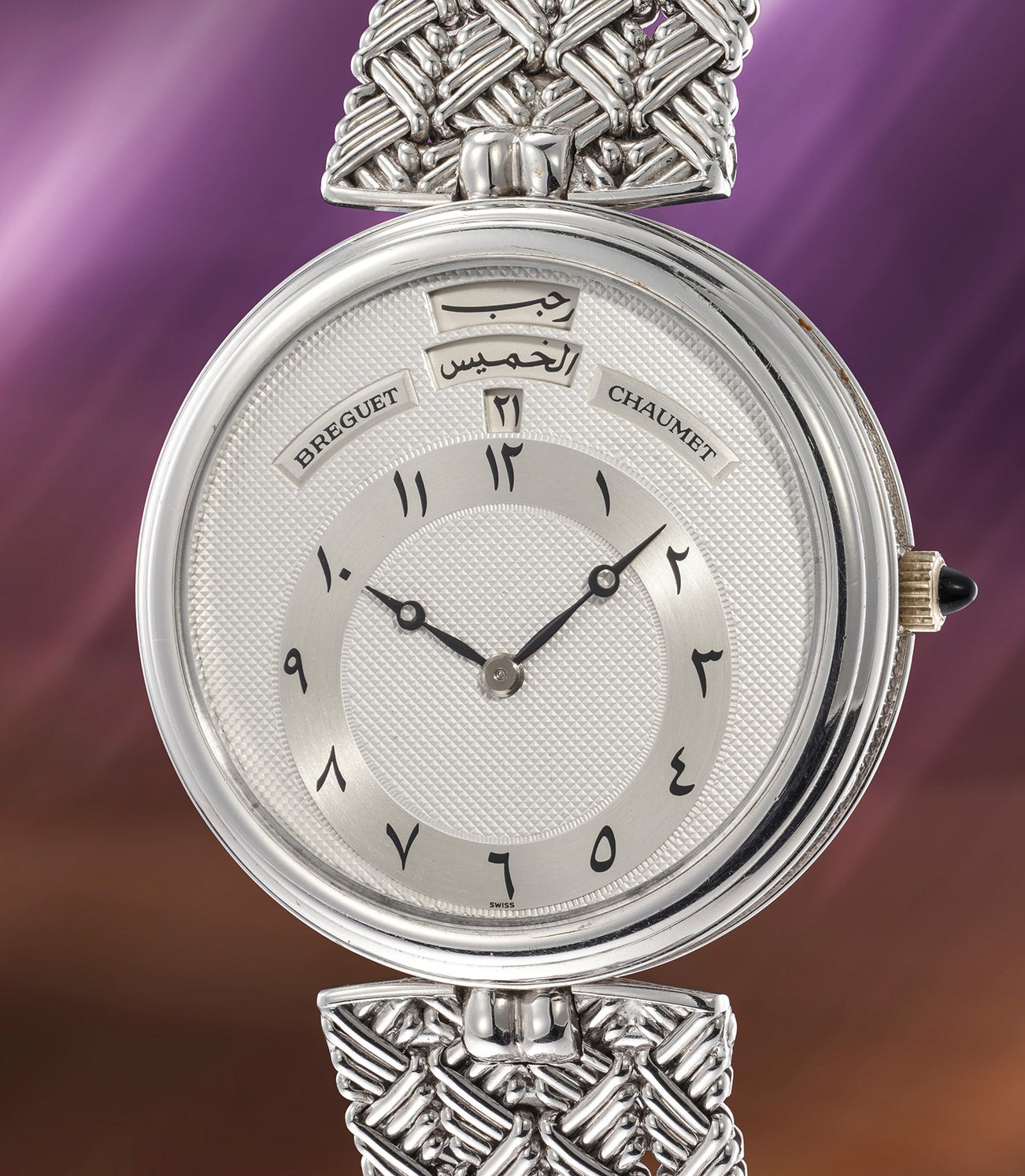 An incredible and exceptionally rare white gold wristwatch with Hijri calendar, Eastern Arabic numerals on bracelet, one of 2 made