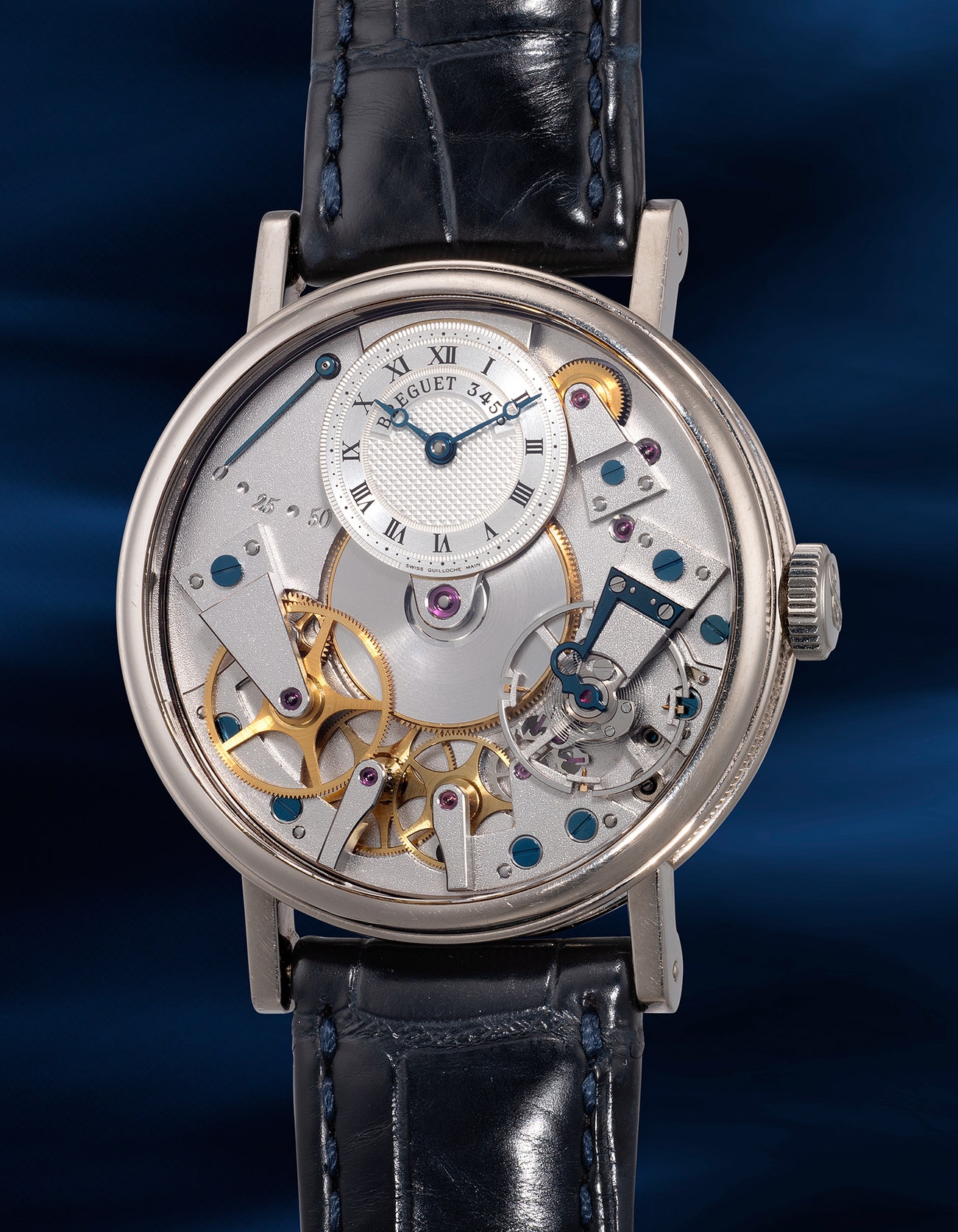 - Taking inspiration from the movement architecture of Breguet’s Souscription watches of the late 18th century, the Tradition displays the magnificent movement through the semi-skeletonized dial, exposing the frosted baseplate and bridges, heat-blued screws, red rubies and golden gear trains. Once powered, the movement is a marvel to behold.