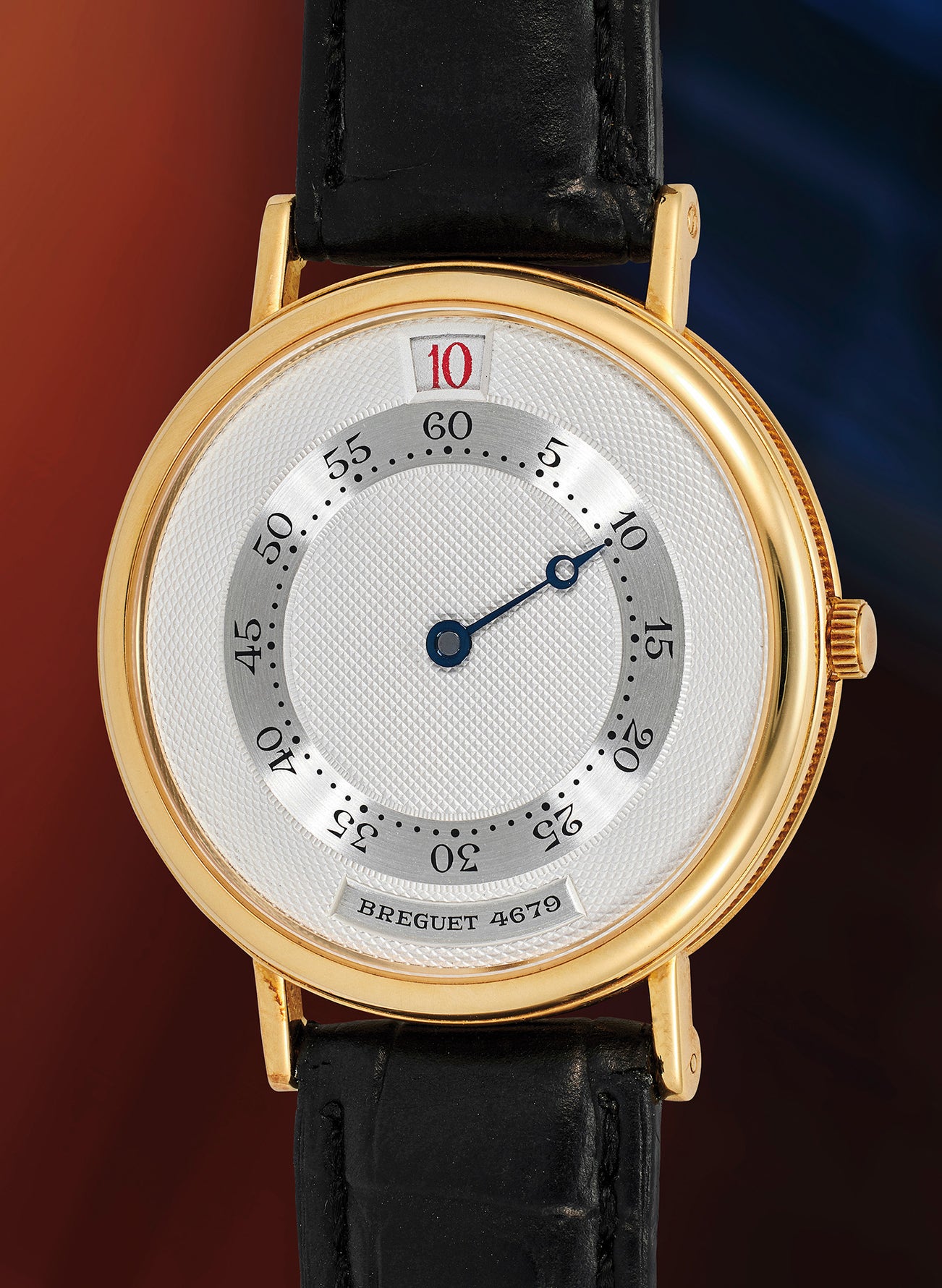 While many of the original “souscription” watches notably featured a single-handed dial, echoed in the current example, the addition of a jump hour powered by an automatic movement adds a contemporary element to the watch. All this is encased in a classic, Breguet-style case with extended downturned lugs and fluted case band, measuring an impressive 36mm in diameter. Preserved in excellent overall condition with crisp hallmarks between the lugs, this rarely seen model is accompanied by its original presentation boxes.