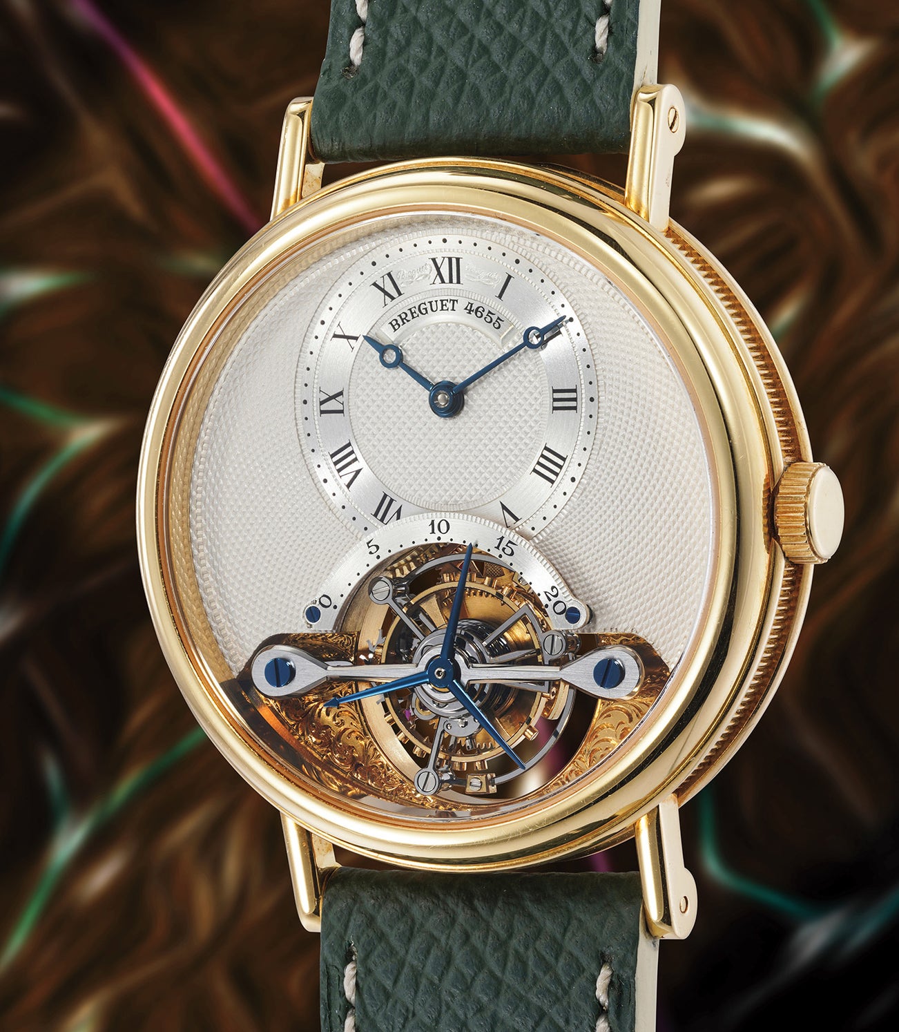 In 1987, Breguet honored this legacy with the introduction of the reference 3350, a model that seamlessly blends classical craftsmanship with modern refinement. Cased in yellow gold, this example exudes a timeless, almost baroque elegance, further enhanced by the ornate filigree decoration on the reverse and the base plate visible beneath the tourbillon. The solid silver dial, adorned with intricate hand-guilloché, features a subtle champagne tone unique to the earliest iterations of the reference. These early examples, such as the present one, lack additional text on the guilloché, a detail that would change in later production runs.