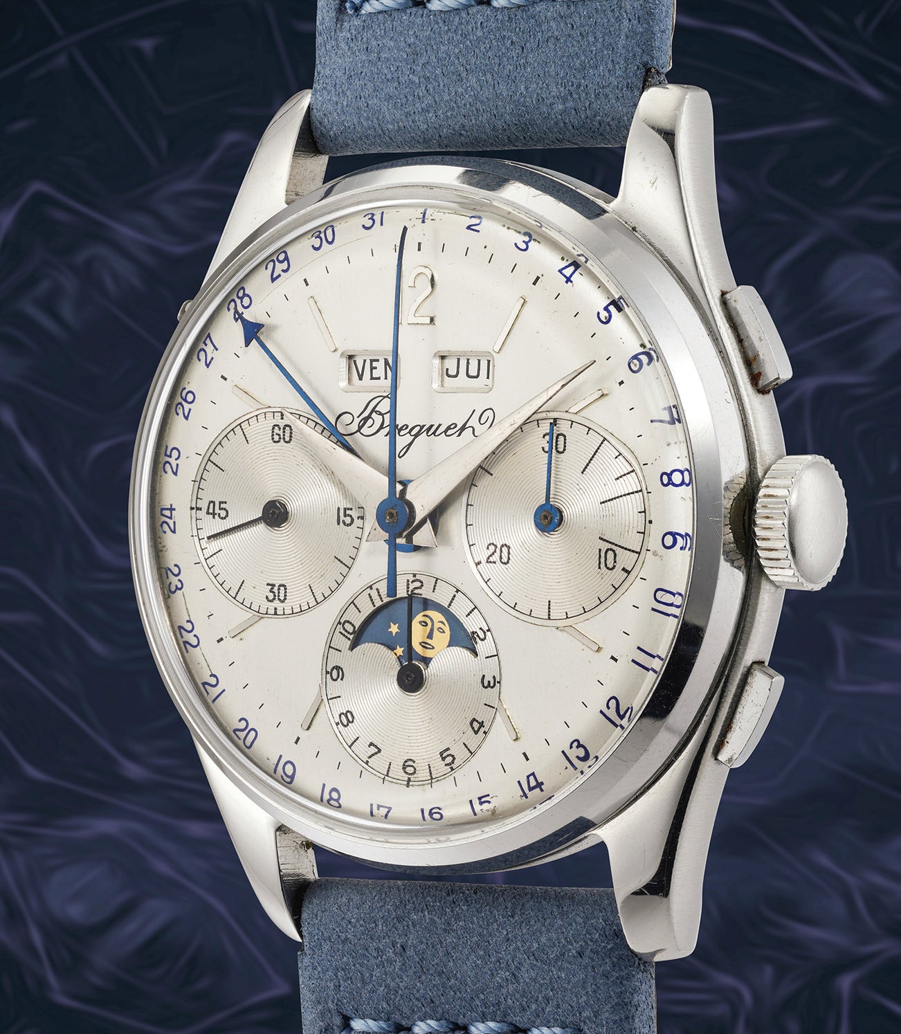 The present lot in stainless steel is a rarity in Breguet’s mid-20th century wristwatch collection since most known examples of Breguet chronographs with calendars and moonphases are cased in gold. The present