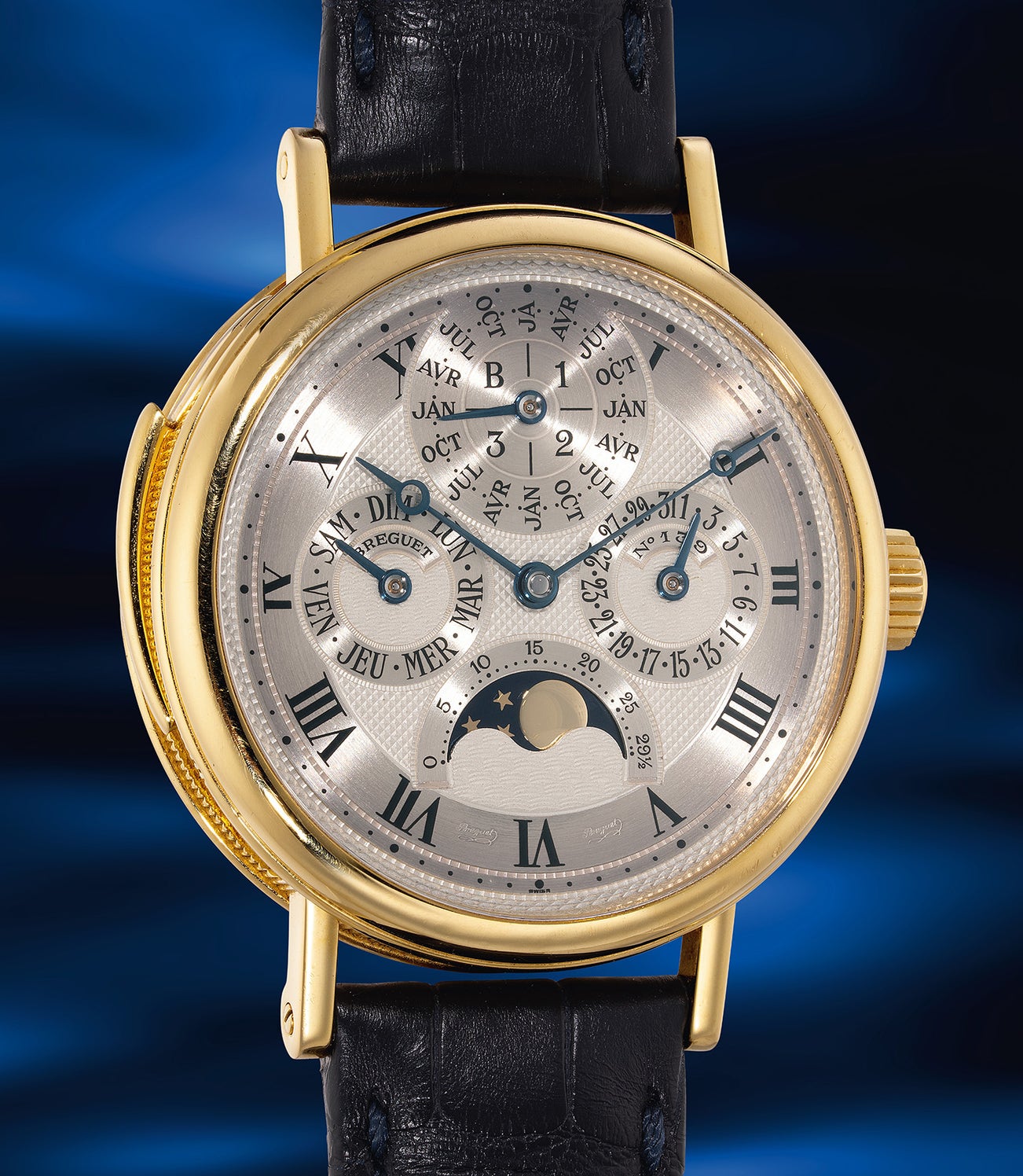 A complicated and well-preserved limited edition souscription yellow gold minute repeating perpetual calendar wristwatch with guilloche dial, French calendar, moon phases and leap year indication, numbered 139 of a limited edition of 300 pieces