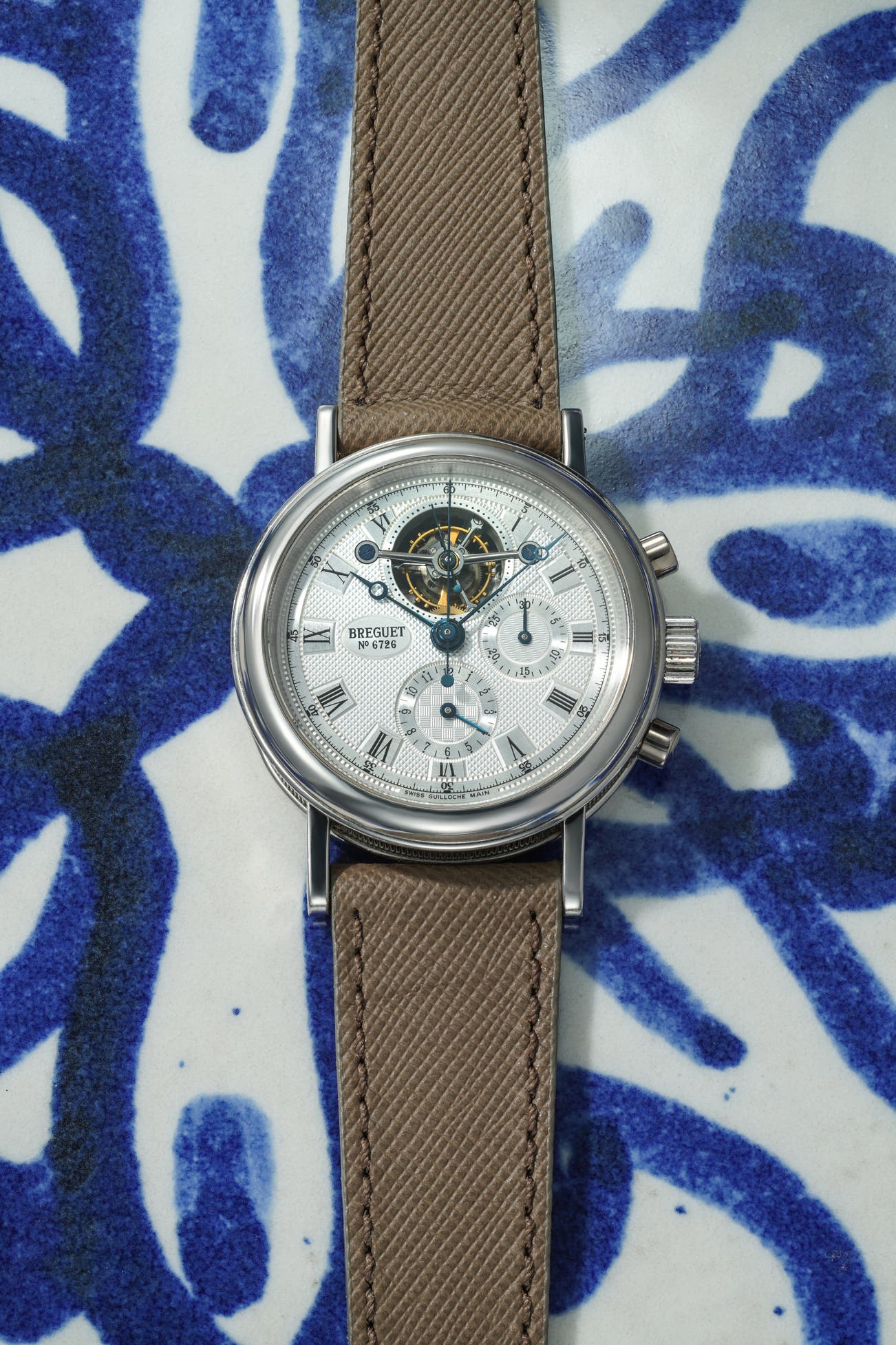 - The reference 3577 “Classique Tourbillon Chronograph” beautifully celebrates Breguet’s legacy. The tourbillon sits proudly at 12 o’clock, surrounded by a rich blend of textures across the silver dial—clous de Paris, basketweave, waves, and brushed finishes—all paired with the brand’s iconic blued hands. It’s classic Breguet through and through.