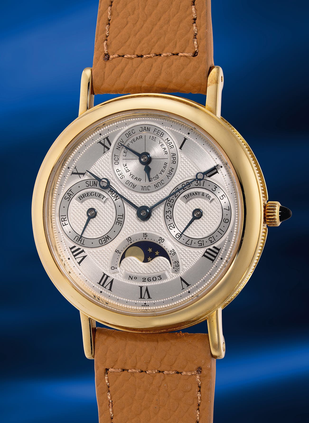 A historically important and rare yellow gold double-signed perpetual calendar wristwatch with moon phases, leap year indication and presentation box, retailed by Tiffany & Co.
