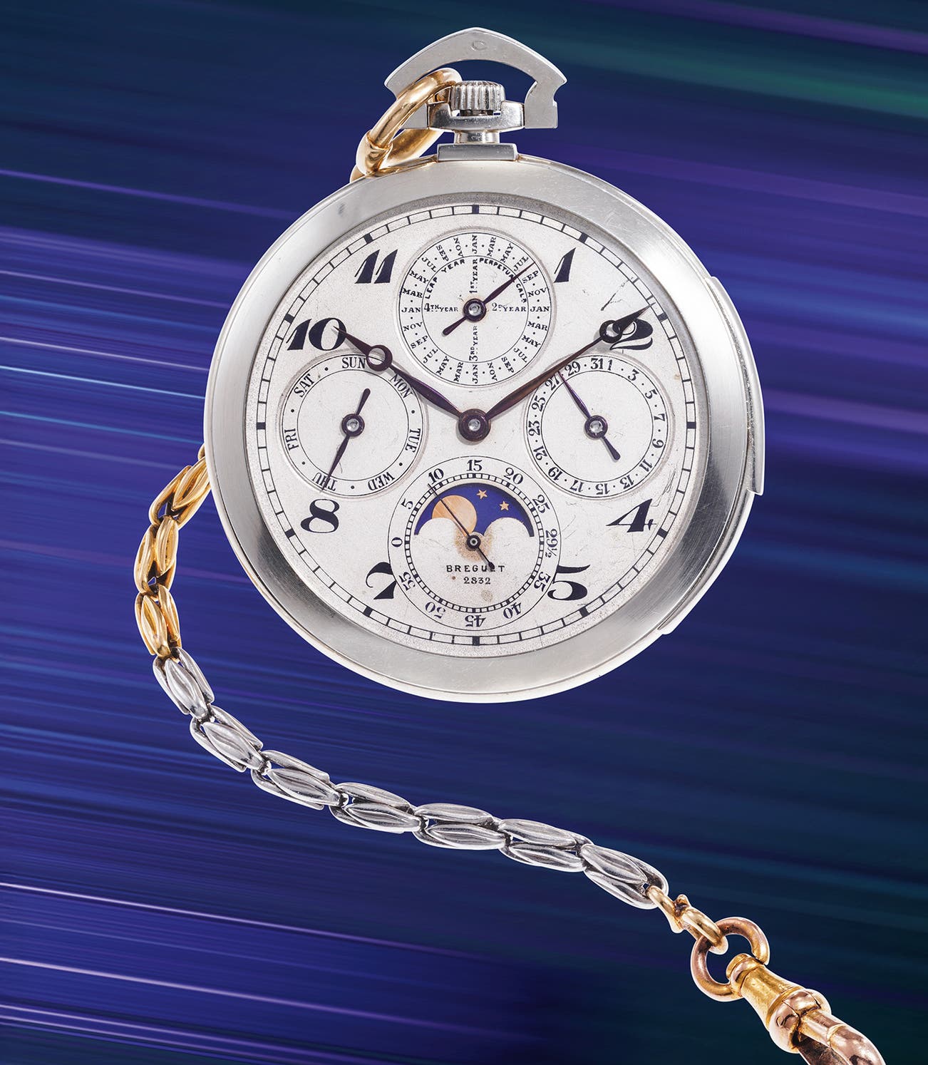 A unique and astounding and ultra rare white gold open face minute repeating perpetual calendar pocket watch with moonphase display