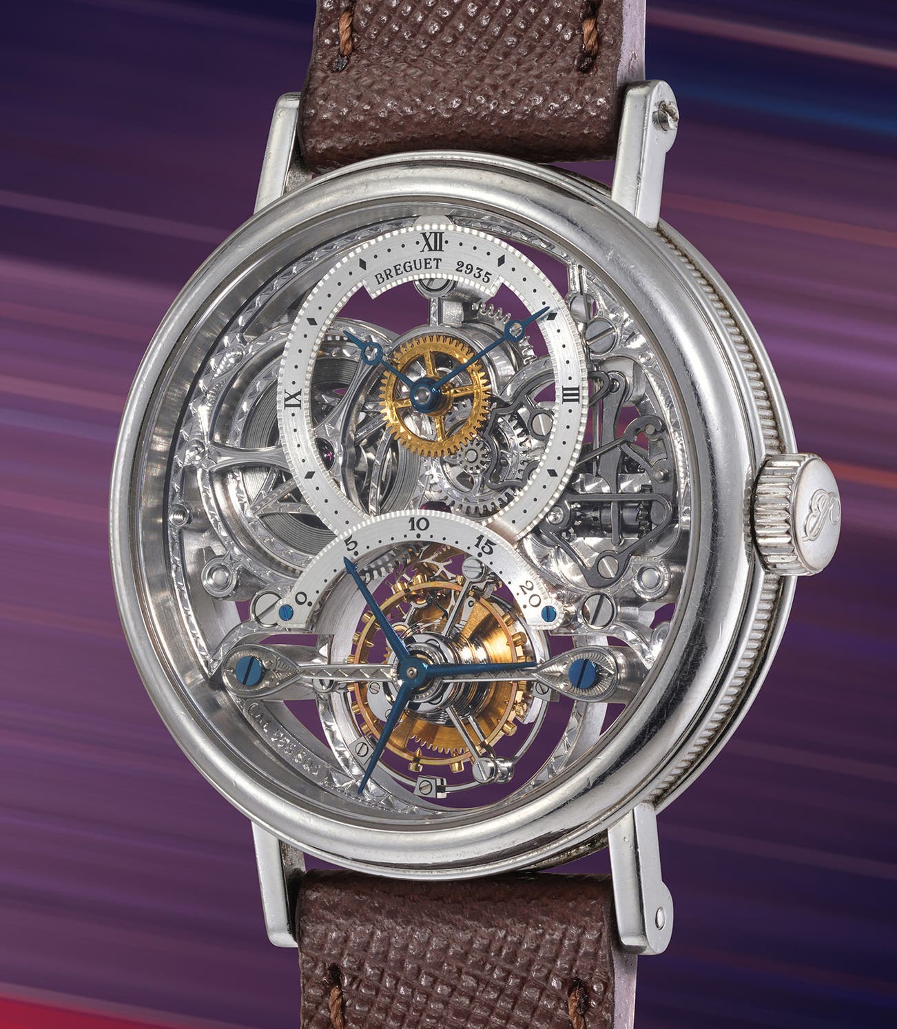 In the 1990s, Breguet introduced the reference 3355, powered by the same esteemed calibre 558 developed under Roth. This model brought a new visual dimension, with a prominent aperture showcasing the tourbillon carriage at the lower part of the dial, while the hours and minutes were offset toward the top. The present example features a platinum skeletonized case with a fully open-worked dial, revealing the movement beneath—adorned with intricate hand-executed filet sauté guilloché.