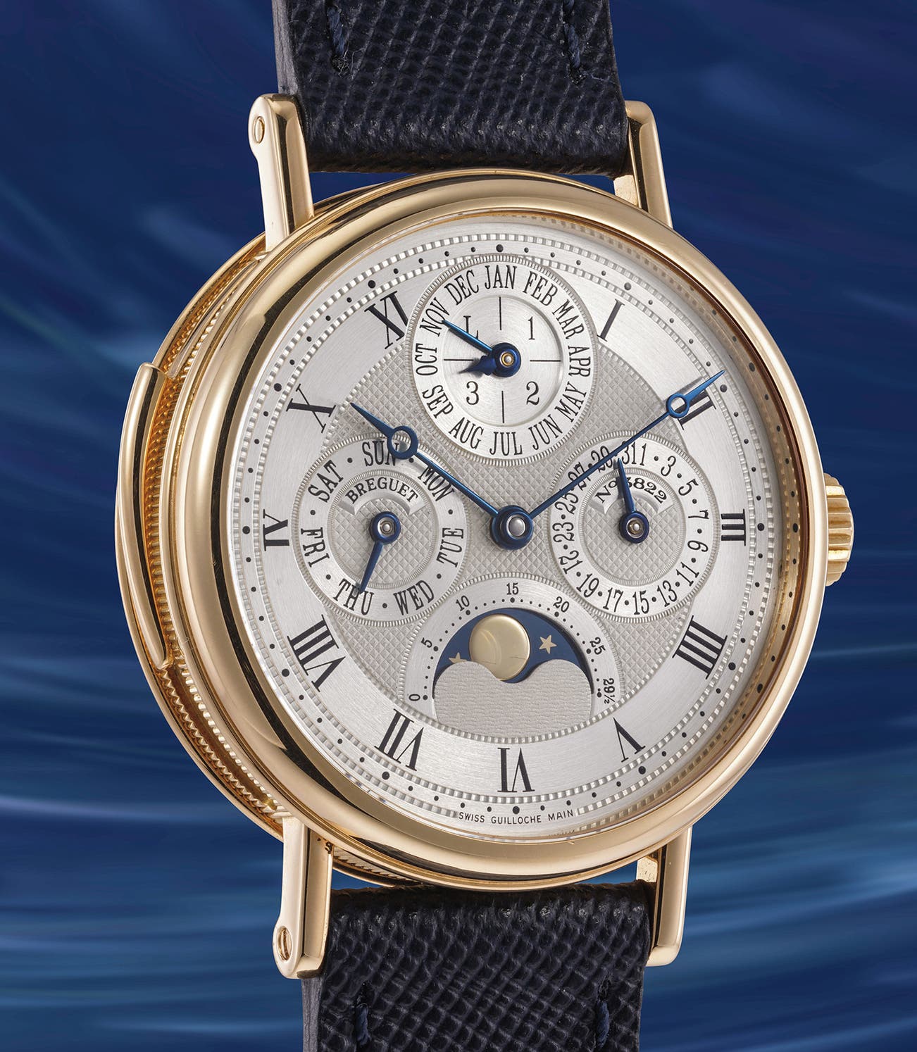 A complicated and extremely rare yellow gold minute repeating perpetual calendar wristwatch with guilloche dial, moon phases, leap year indication, certificate of origin and presentation box