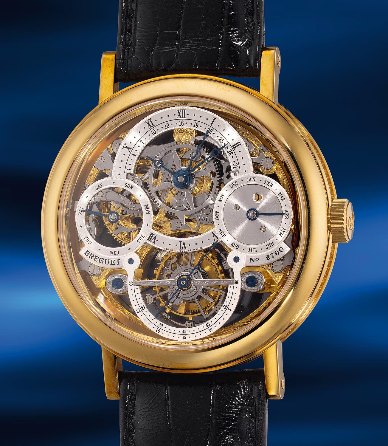 This example is presented in a 40mm yellow gold case with Breguet’s signature fluted caseband and polished bezel. The skeletonised dial reveals the hand-engraved manually-wound movement. It features a one-minute tourbillon at 6 o’clock, off-centred time display with retrograde date at 12, and leap year indications at 3 o'clock.