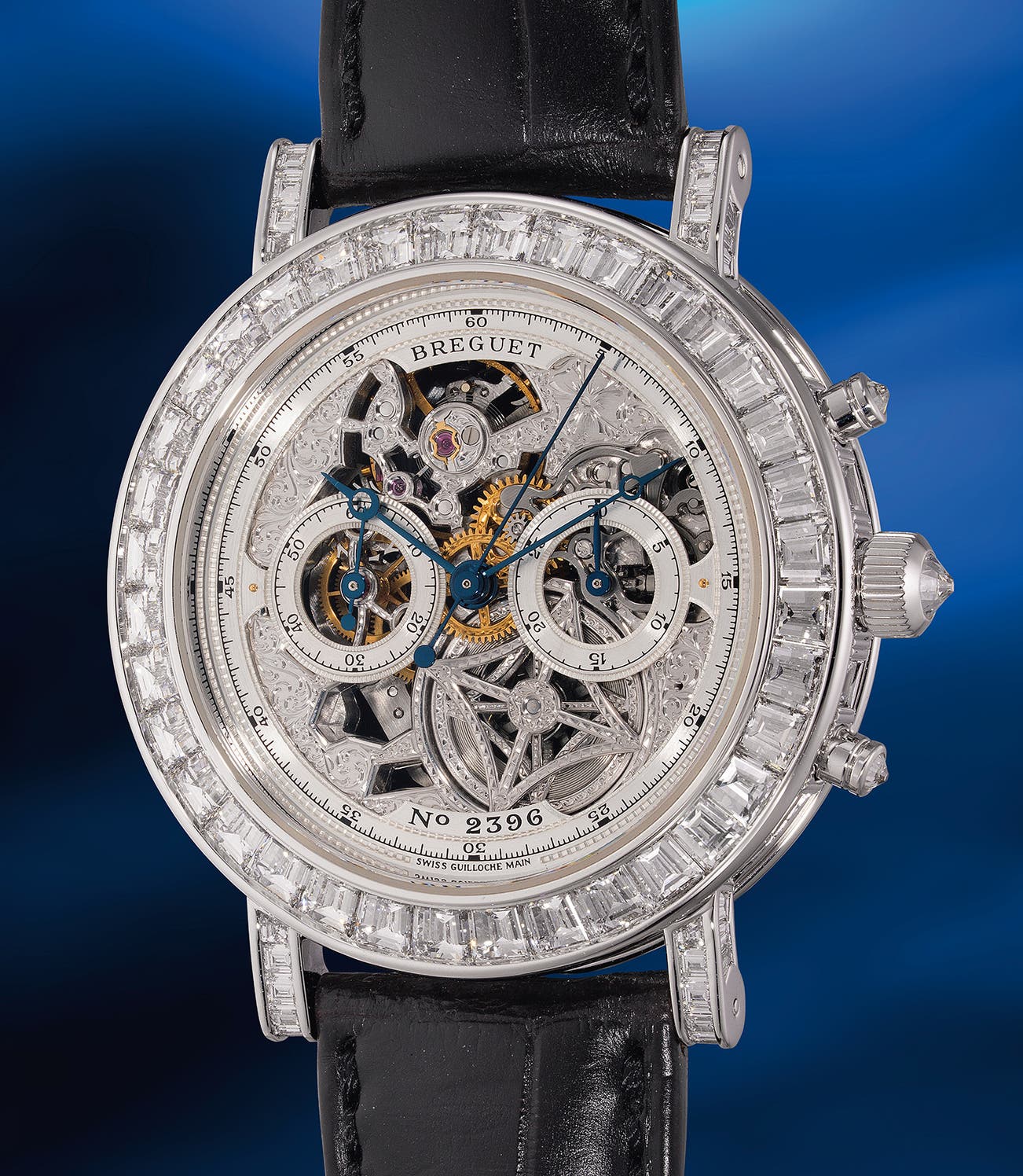 An impressive, highly rare and attractive white gold skeletonized baguette diamond-set chronograph wristwatch with warranty and presentation box