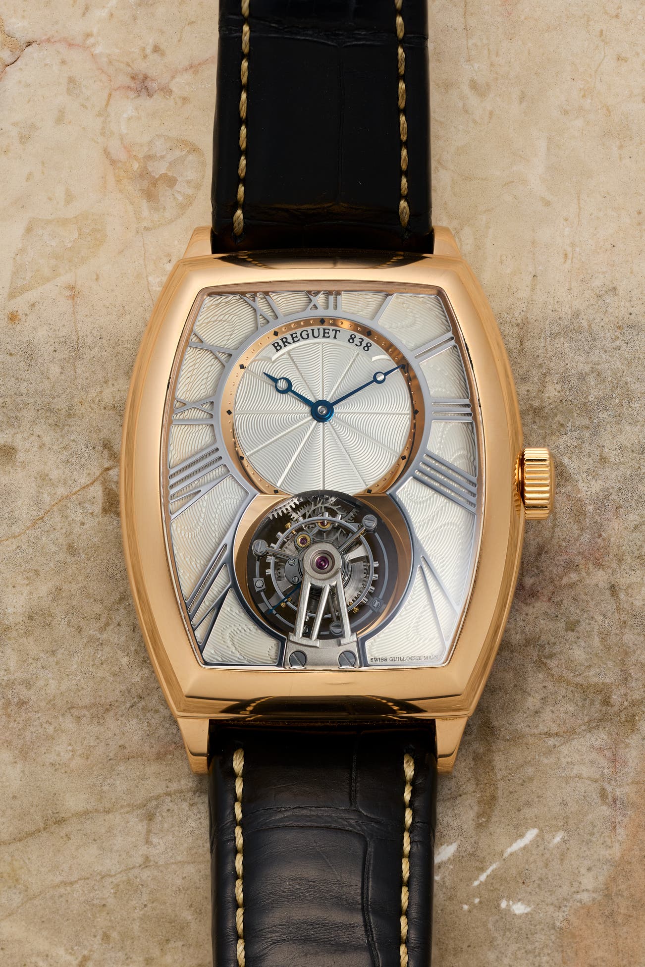 A very fine and attractive pink gold tonneau-shaped tourbillon wristwatch with guilloché dial