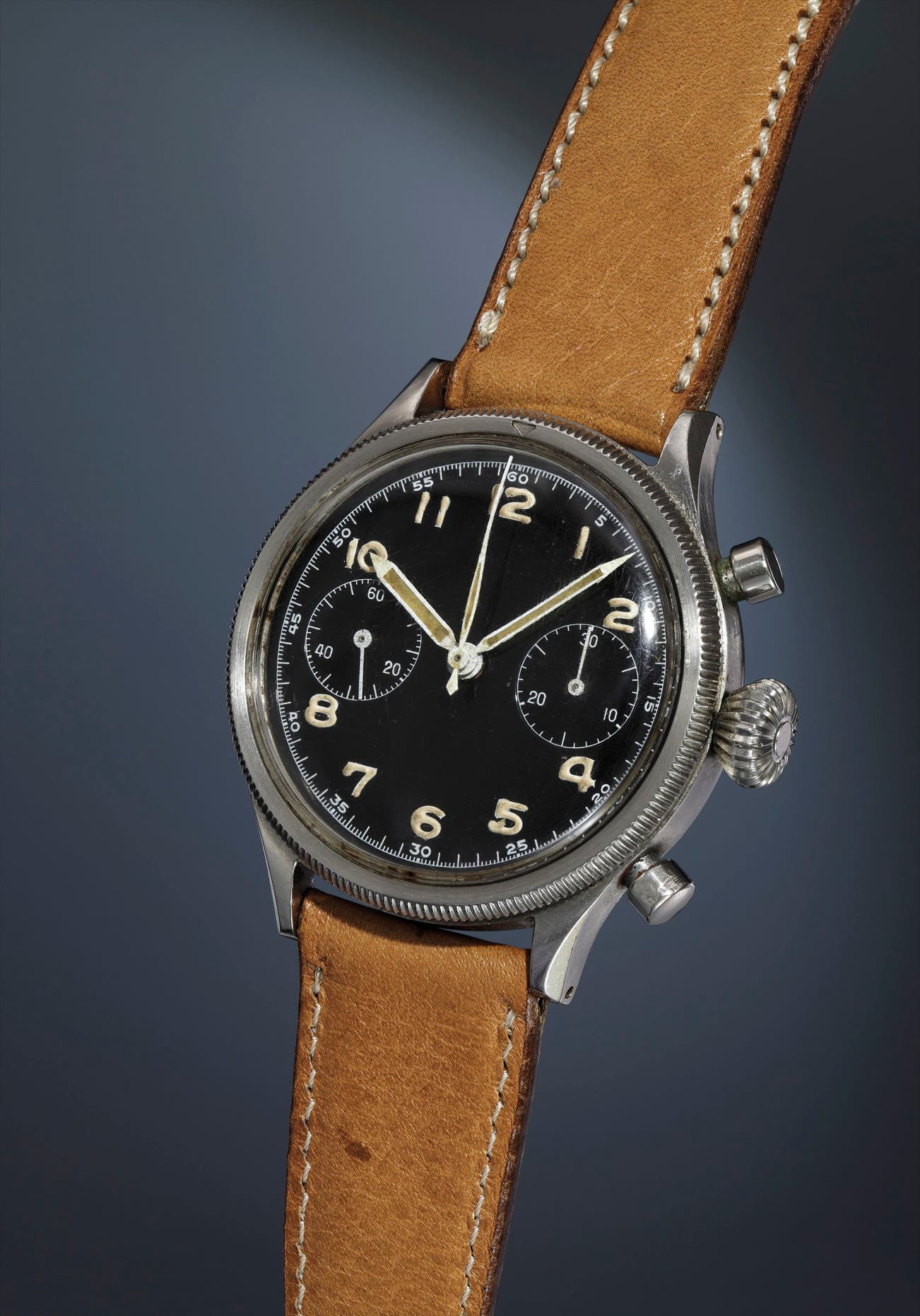 The most noteworthy function of all Type XX chronographs is their “fly-back” complication. Important for navigation, a pilot could quickly reset the chronograph seconds hand to zero while it’s running, without needing to first stop then reset. The present lot is fitted with its original, oversized “onion crown”, enhancing the watches appeal and presence. The large luminous Arabic hour markers and hands were easily legible against the wonderful, black lacquer dial. This well-preserved Breguet Type XX offers rarity, originality, and a military history, which is sure to elevate the next collection it ultimately joins.