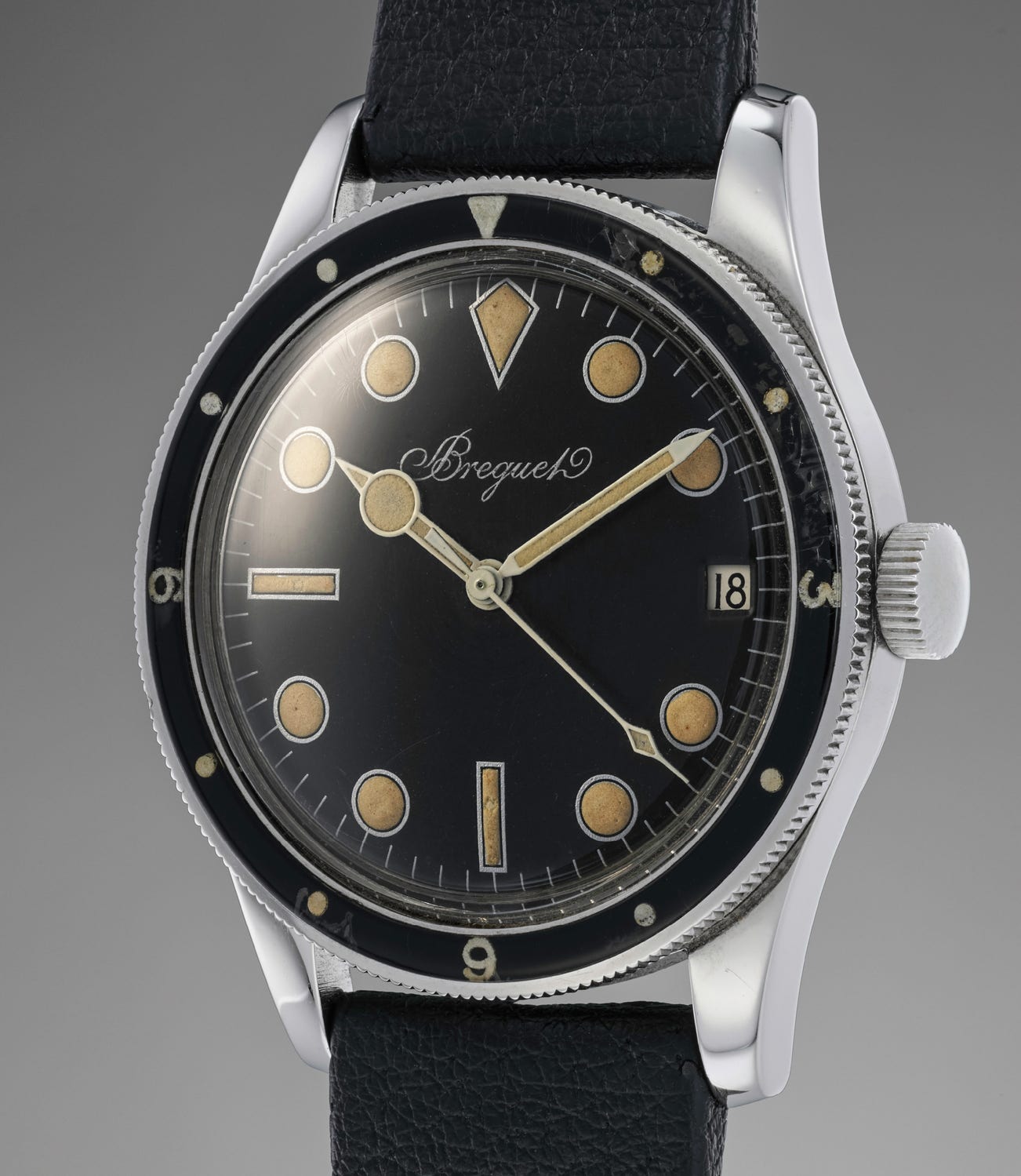 Scholarship indicates that Breguet made less than 60 dive watches such as the present model with varying dial designs including a version with smaller indexes and another with Arabic numerals.