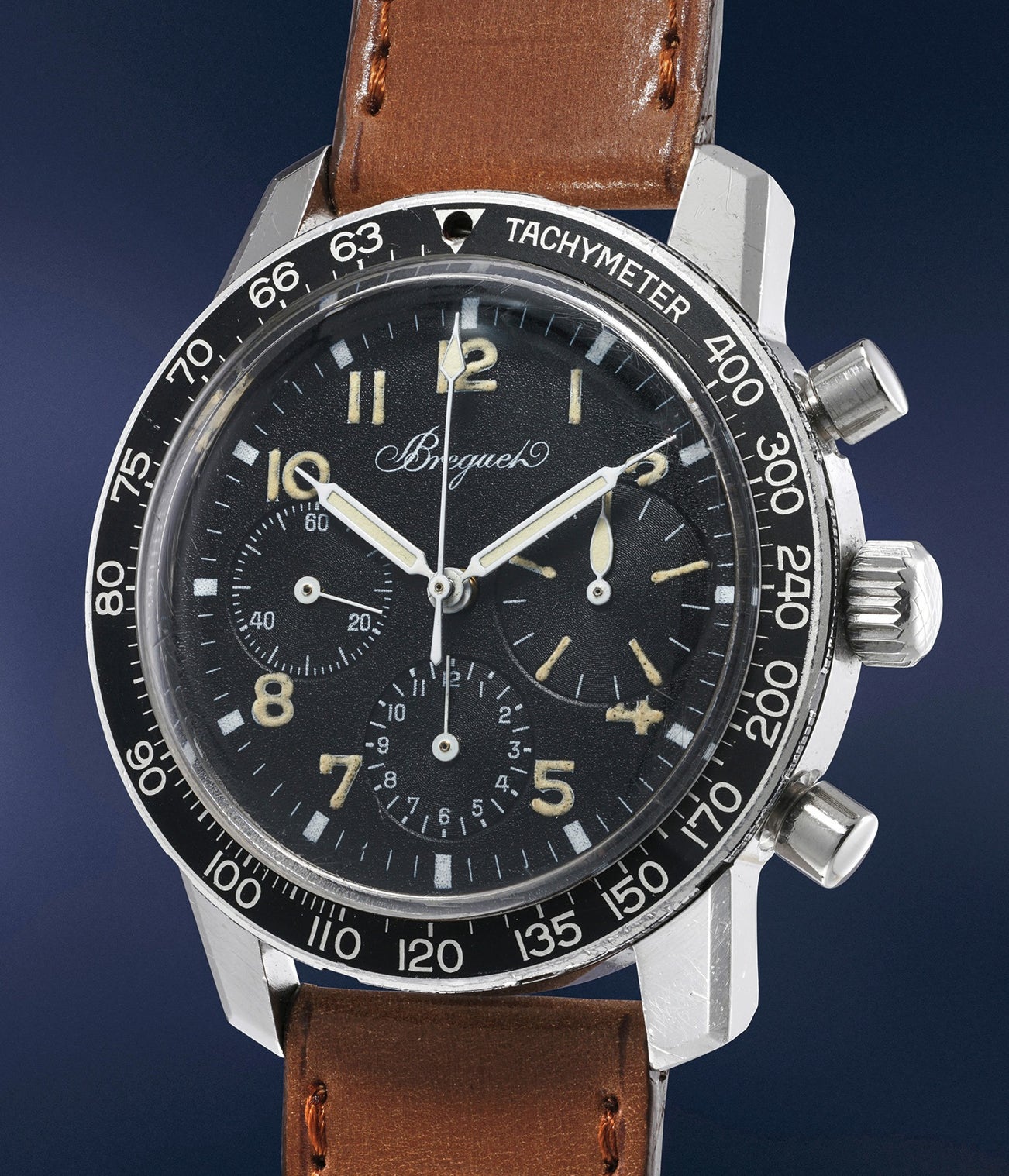 In the early 1970s Breguet submitted a proposal for a new generation of military chronographs, keeping with the original Type XX’s large Arabic numerals and flyback function but with a different case design with larger diameter and thicker lugs and a black rotating bezel for greater legibility. It is believed that only a very low number of watches were delivered the French forces, the vast majority being in sold by Breguet to civilians.