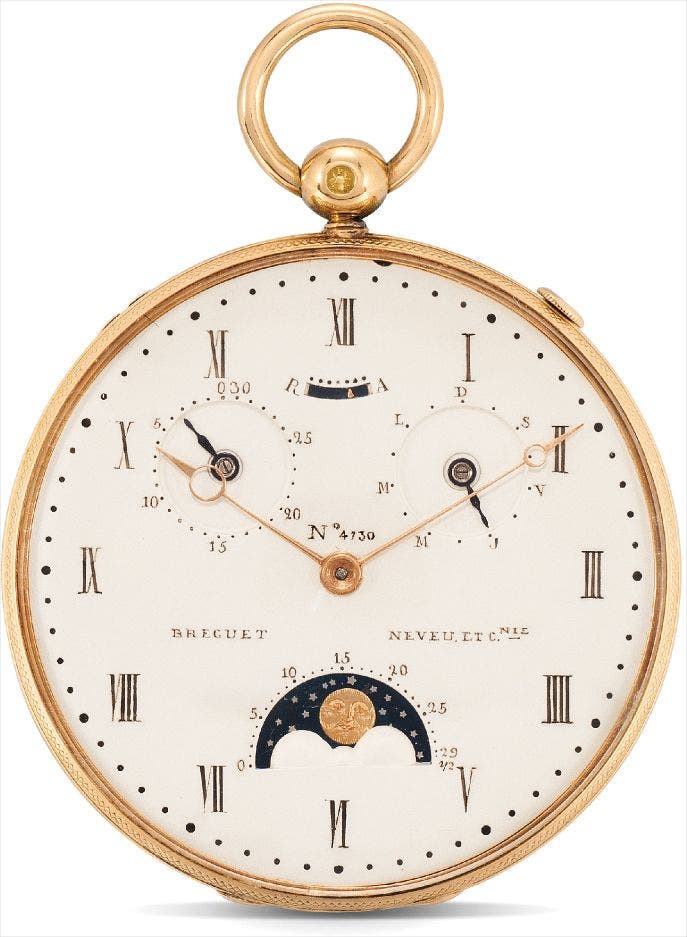 This miniature complicated watch, numbered 4730, previously unknown to the market or recorded anywhere in literature, is an incredible watch on many levels. The first is the size, the case measures 37 millimetres, which is slightly larger than a one Euro coin. Next, is the provenance of the watch, having been sold to the Russian Princess Catherina Bagration in 1829 and rumoured to be a gift for Colonel Caradoc, whom she was married to at the time. This marriage soon ended and the watch was resold to Breguet in 1830. In 1835, the watch was then resold to Mr. Nathaniel de Rothschild, the famous businessman, banker and winemaker, whom established the Chateau Mouton Rothschild.