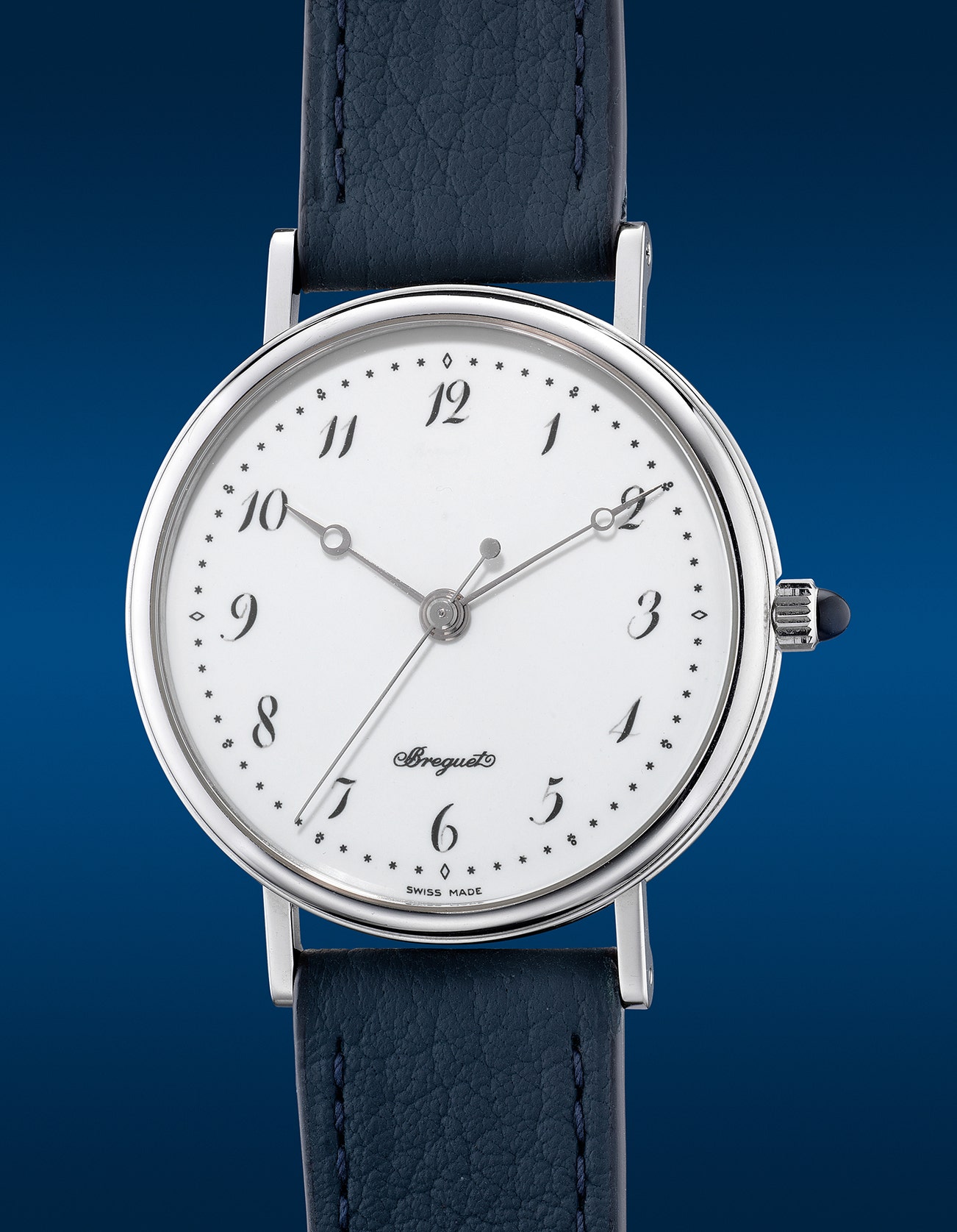 - The present Breguet Classique ref. 1775 was introduced at the turn of the millennium to celebrate the 225th anniversary of the manufacturer. Encased in a classic 36mm diameter case with a fausses côtes embellished caseband, the present platinum example is simply iconic. Under the crystal lies a beautiful white enamel dial with its signature painted Breguet numerals, with an “invisible” Breguet signature hiding in plain sight, engraved subtly at the 12 o’clock position and is only visible with a loupe.