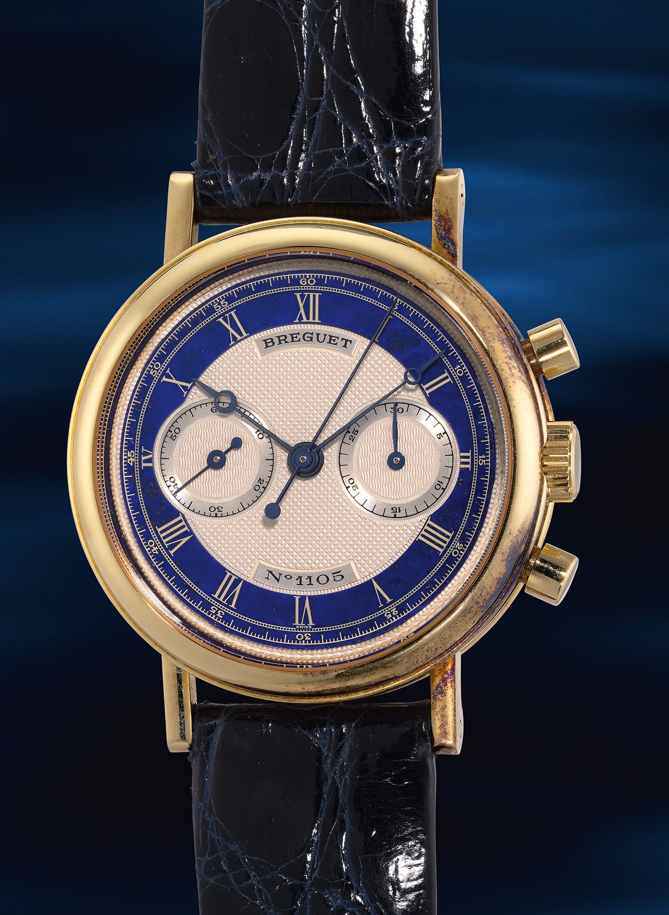 The timepiece is distinguished for its hour and minute ring made of lapis lazuli, a very unusual material for Breguet. The lapis lazuli minute and hour ring feature delicately printed silver Roman numerals. The mesmerizing blue of the lapis lazuli dominates and dictates the look of the entire watch, and the technical achievement of cutting out the solid lapis lazuli wafer in this very particular and unusual shape is simply awestriking. The elegant yellow gold case is further marked by a beautiful layer of patina that has developed on the surface over time, imbuing the timepiece with an enchanting old-world charm.