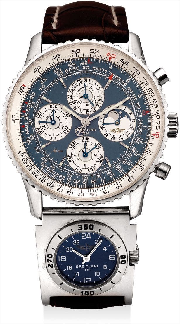 This present Navitimer QP is a very rare variant as it features a detachable dial for 24 hours display. Highly exclusive and complex, the platinum case with its bi-directional rotating aviation slide rule houses a sophisticated movement comprising perpetual calendar, moon phases, season and leap year indicator. Limited to 25 pieces only, the present watch is consigned by the original owner and complete with all original accessories along with three additional crocodile leather straps.