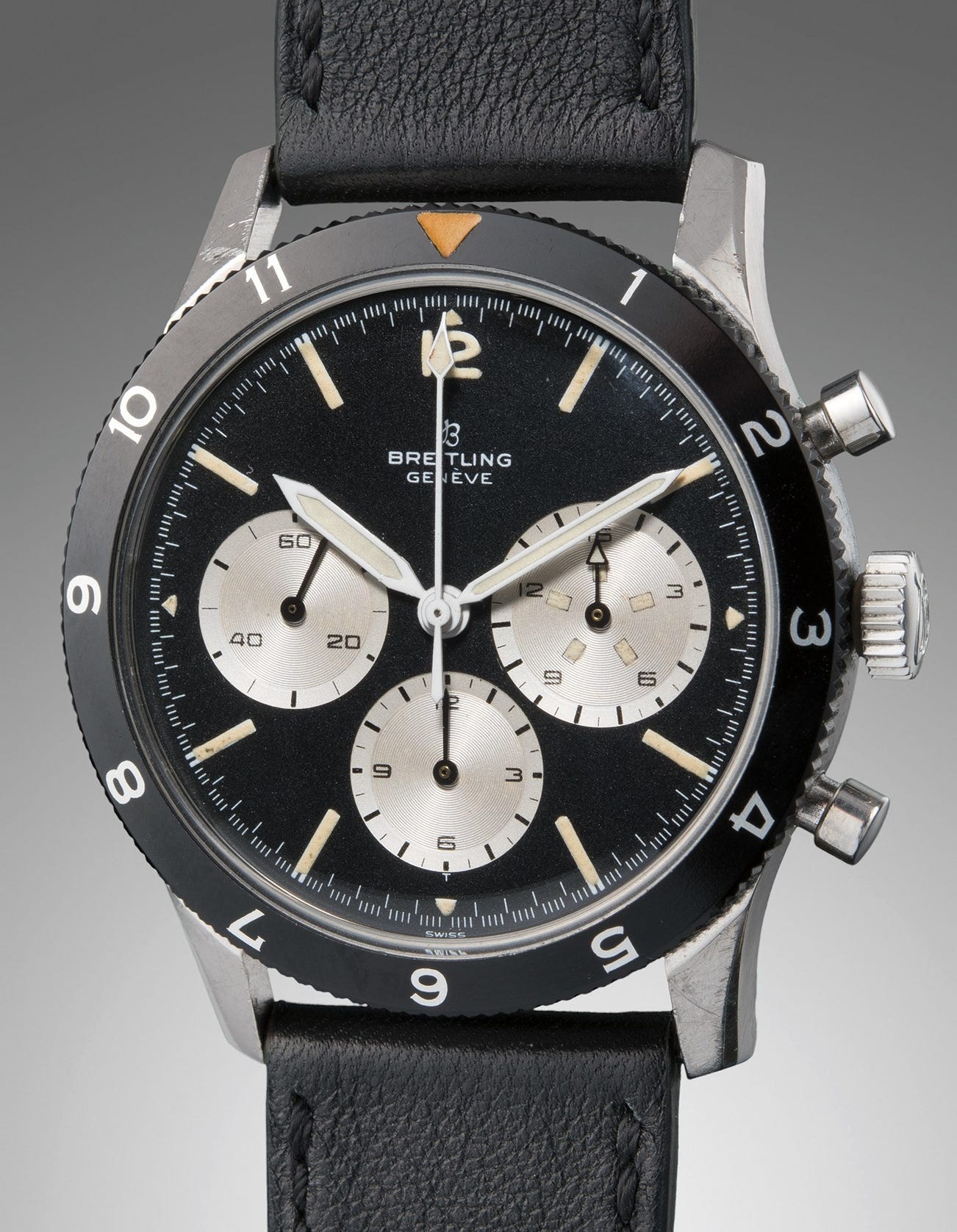 Established in 1884, Breitling is best known for their aviation-related timepieces such as the iconic Navitimer. But the manufacturer was an early pioneer in the development of wristwatch chronographs, with their innovative tool watches supplying armed forces worldwide, as well as timepieces for racing, diving, and leisure activities. The Breitling 765 Co-Pilot was created, as its name suggests, for airplane pilots, who benefited from an oversized 15-minute counter at 3 o’clock and twelve hour rotating bezel. The Co-Pilot replaced an earlier reference 765 "Digital" that featured a digital minutes counter at 3 o’clock and incorporated an oversized minute counter fitted with large luminous indicators at each three minute increment. Legibility in low light conditions and accuracy were paramount in the creation of this Co-Pilot, and it was eventually even adopted for military use.