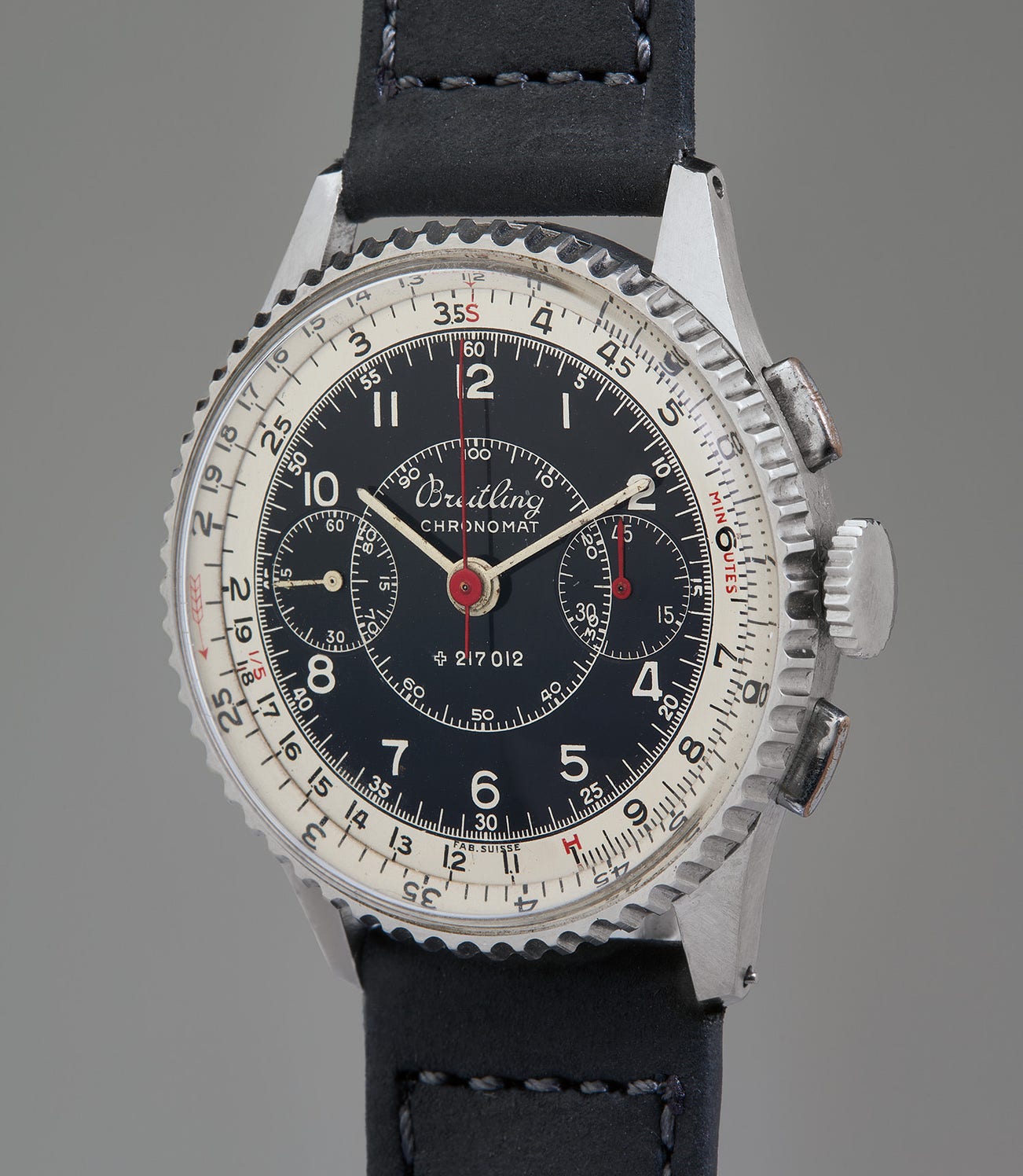The present example is exceptionally rare - fitted with a hardly-ever seen stunning glossy black dial and white sub-dials. It remains well-preserved in outstanding original condition with a sharp case and crisp serial numbers engraved on its caseback. According to Breitling’s archive, this is a very early example featuring only the case number, and not the reference number as seen on later models, as well as the earlier Venus 150 movement versus the later Venus 175. Furthermore, the dial is designated “Fab. Suisse” at 6 o’clock – a rare characteristic indicating the watch was made for the French market.