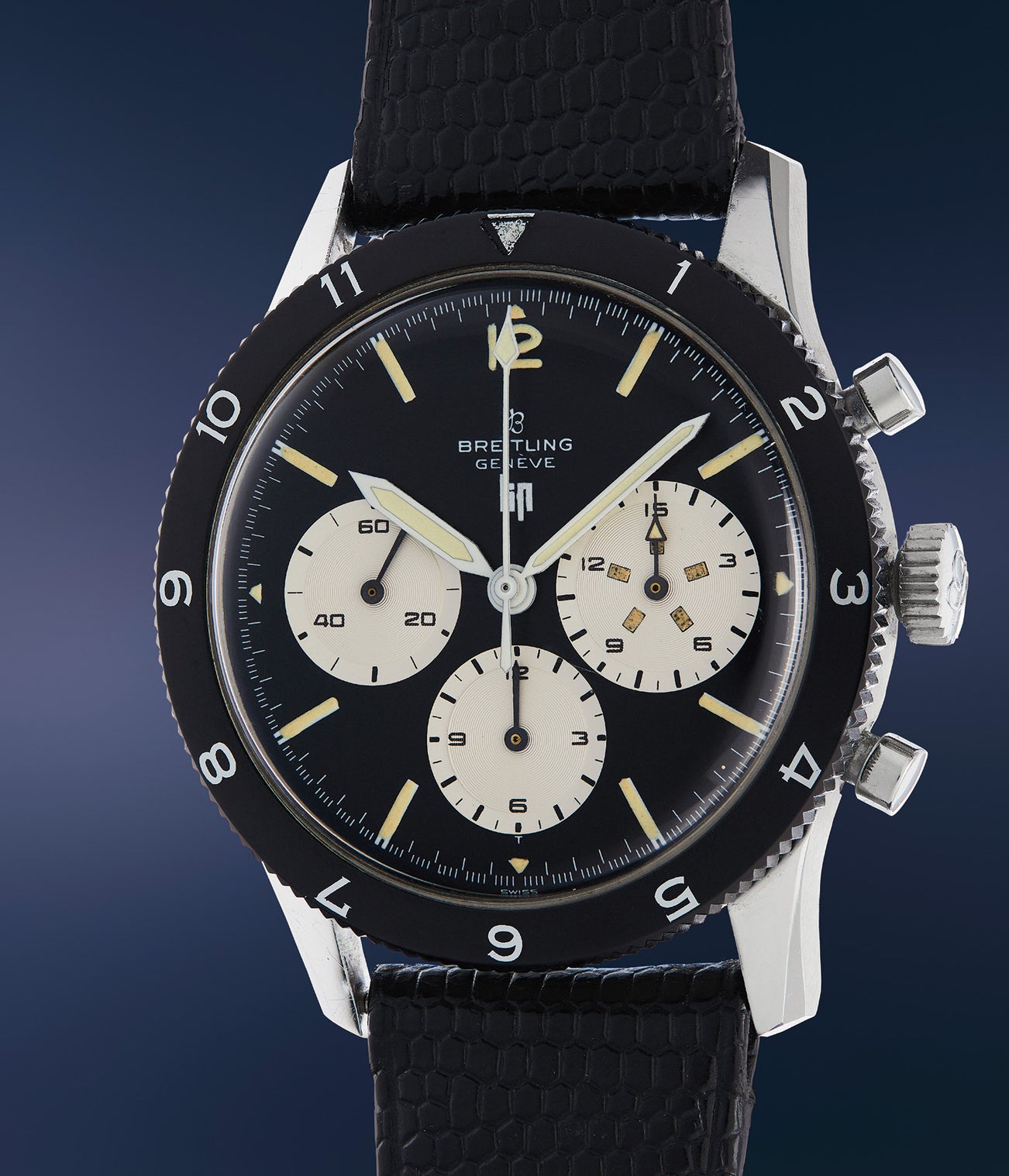 Developed in the early 1960s, Breitling’s reference 765 AVI was to become one of the official timepieces for the French Naval Airforce, hence the inscribed “AVI” inscription on the caseback. At the time, Breitling was just one of several manufacturers developing a military timepiece under strict guidelines from the French military. As a pilot’s watch, the timepiece featured an oversized 15-minute counter at 3 o’clock and twelve hour rotating bezel, useful for navigational calculations. The Co-Pilot replaced an earlier reference 765 "Digital" that featured a digital minute’s counter at 3 o’clock and incorporated an oversized minute counter fitted with large luminous indicators at each three minute increment. Legibility in low light conditions and accuracy were paramount in the creation of this Co-Pilot.