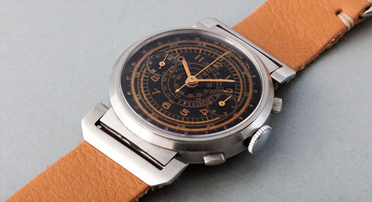Furthermore highlighted with an eye catching black dial, it has a fantastic bronzed effect to the printing of the spiral tachometer and the outer telemeter scales, which adds character to an already interesting collectors' watch.