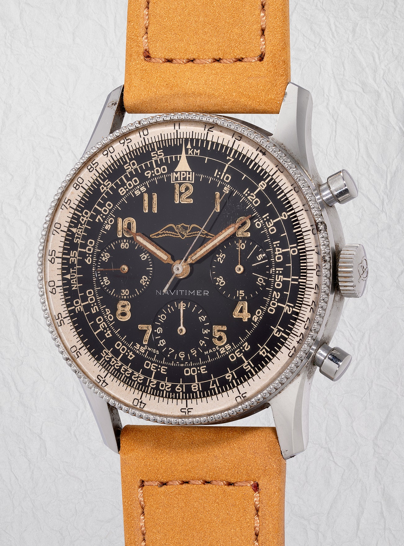 A rare Breitling Navitimer ref. 806 “AOPA” collected by Toshio Masio, this is a beautiful specimen that boast another early batch feature, the small beaded slide ruler with 124 beads. A well-preserved dial with superbly aged luminous numerals and hands, it reacts strongly under the Geiger counter. According to Breitling's archive, the present timepiece dates back to October 1955.