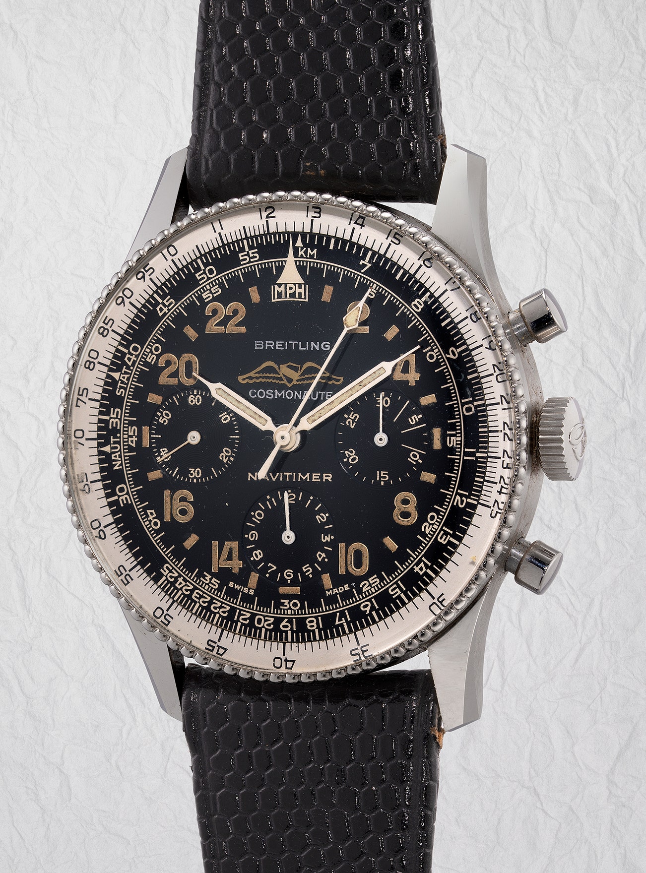 The hands set is unique to Mk1 and Mk2 Navitimer Cosmonaute with lumed tip chrono sweep hand and the wide lumed syringe hands. Powered by the calibre 178, these movements were stamped with WOG as an USA import code by Wakmann. According to Breitling's archive, the present timepiece dates back to October 1963.