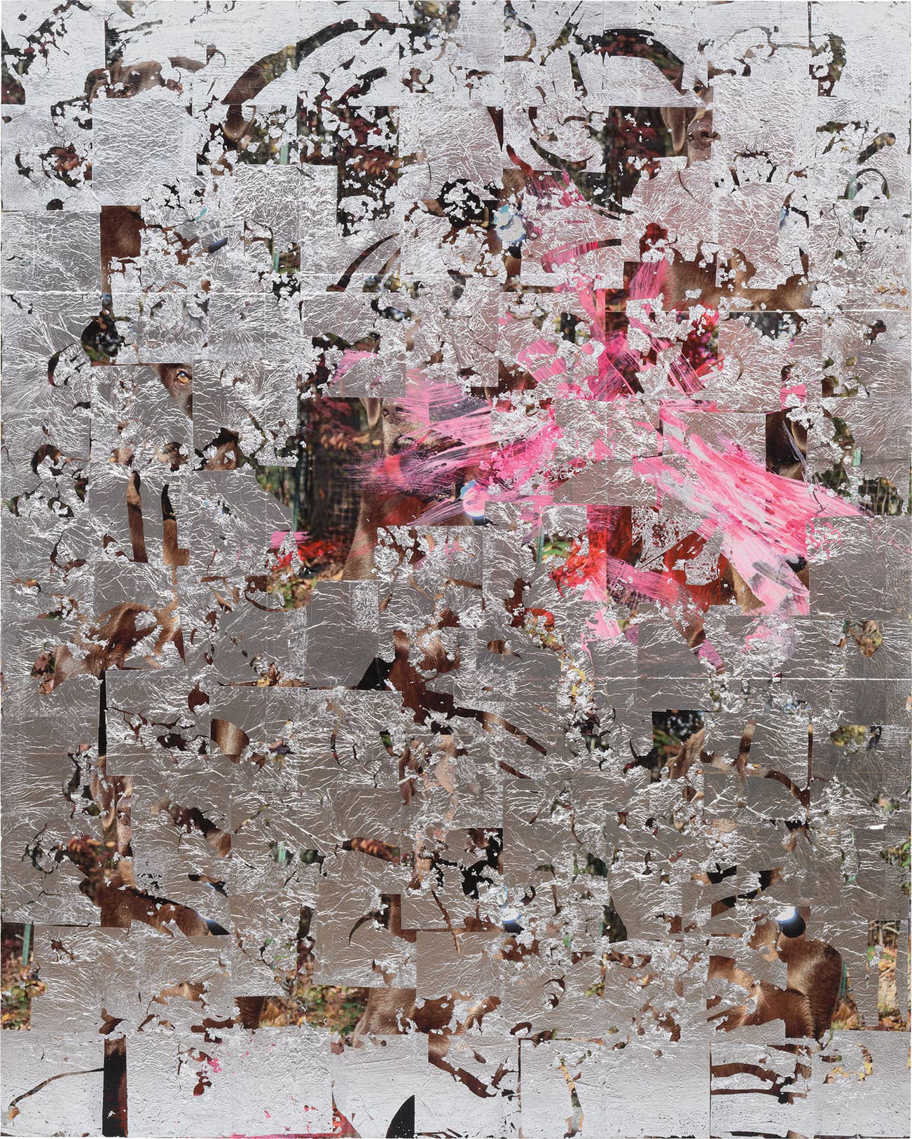 posters, aluminum leaf and acrylic on panel
