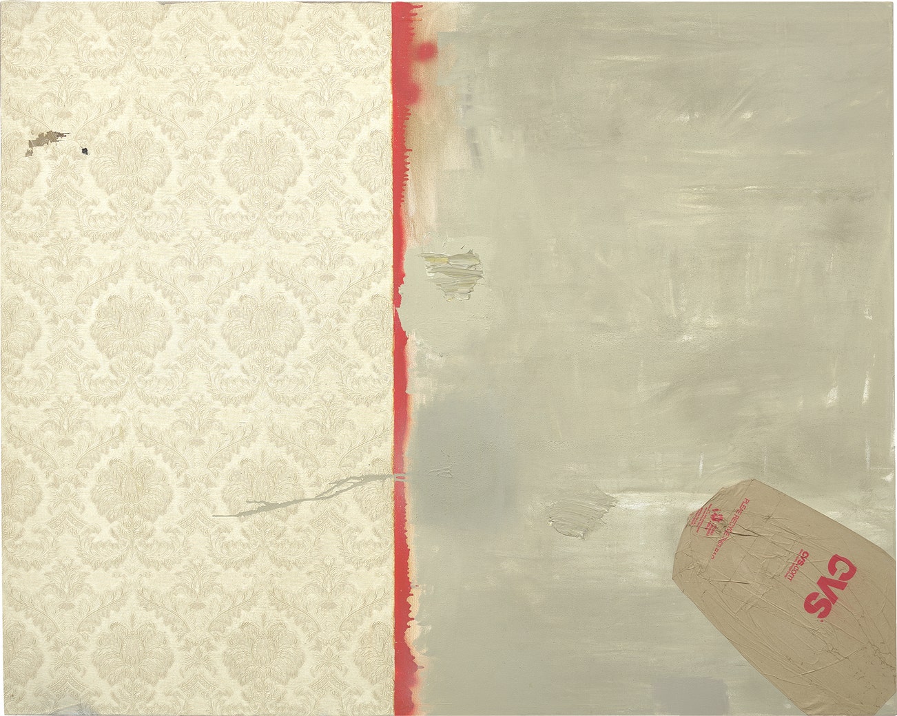 acrylic, spray paint, ink, fabric collage and paper collage on canvas