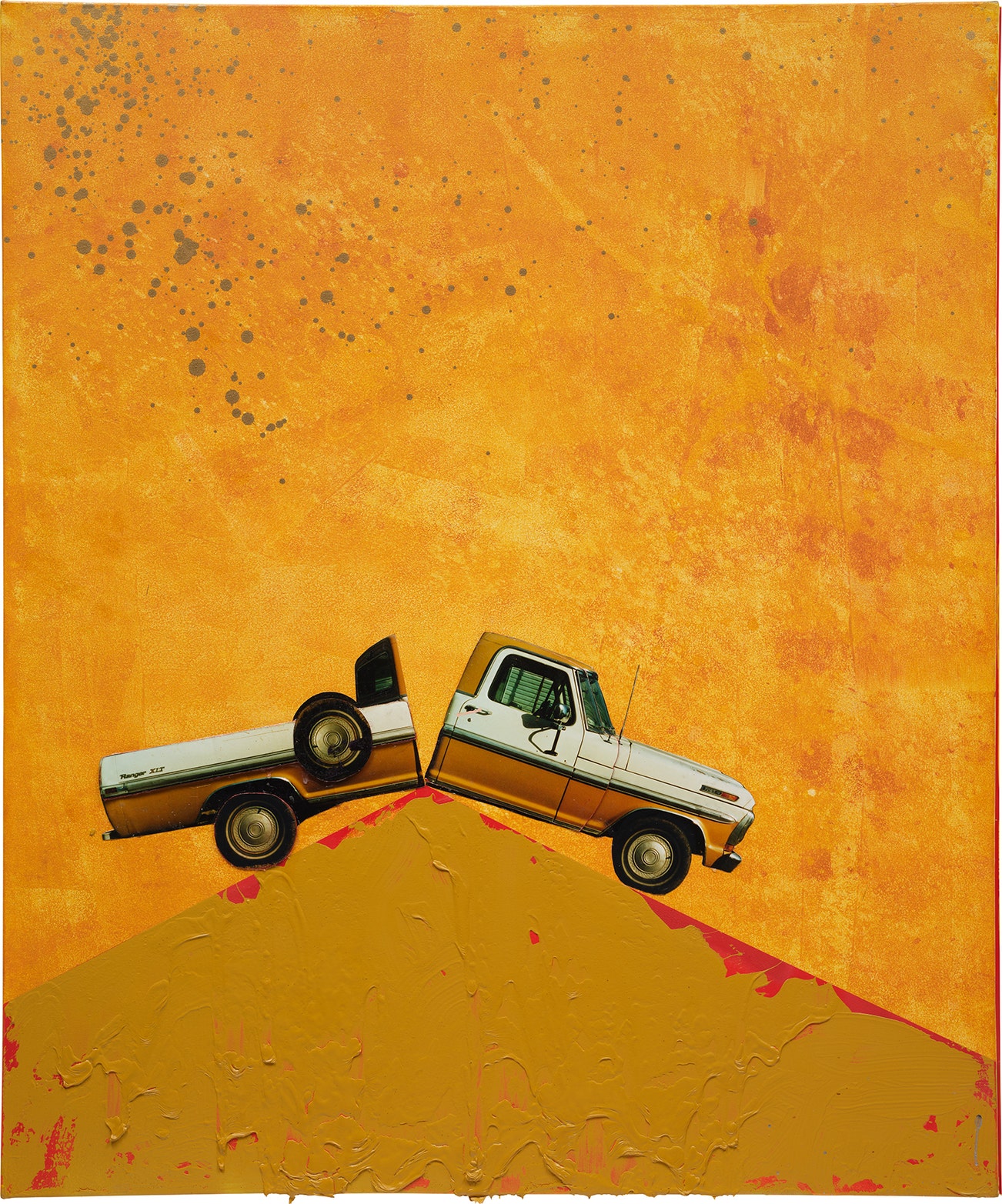 acrylic, spray paint, photograph collage and cardboard on canvas, in artist's frame