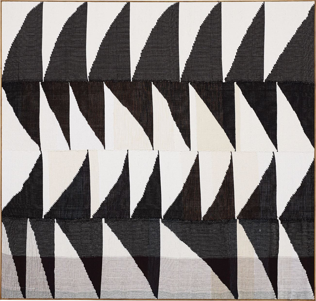 handwoven fibers, wool, cotton, acrylic on canvas, in artist's frame