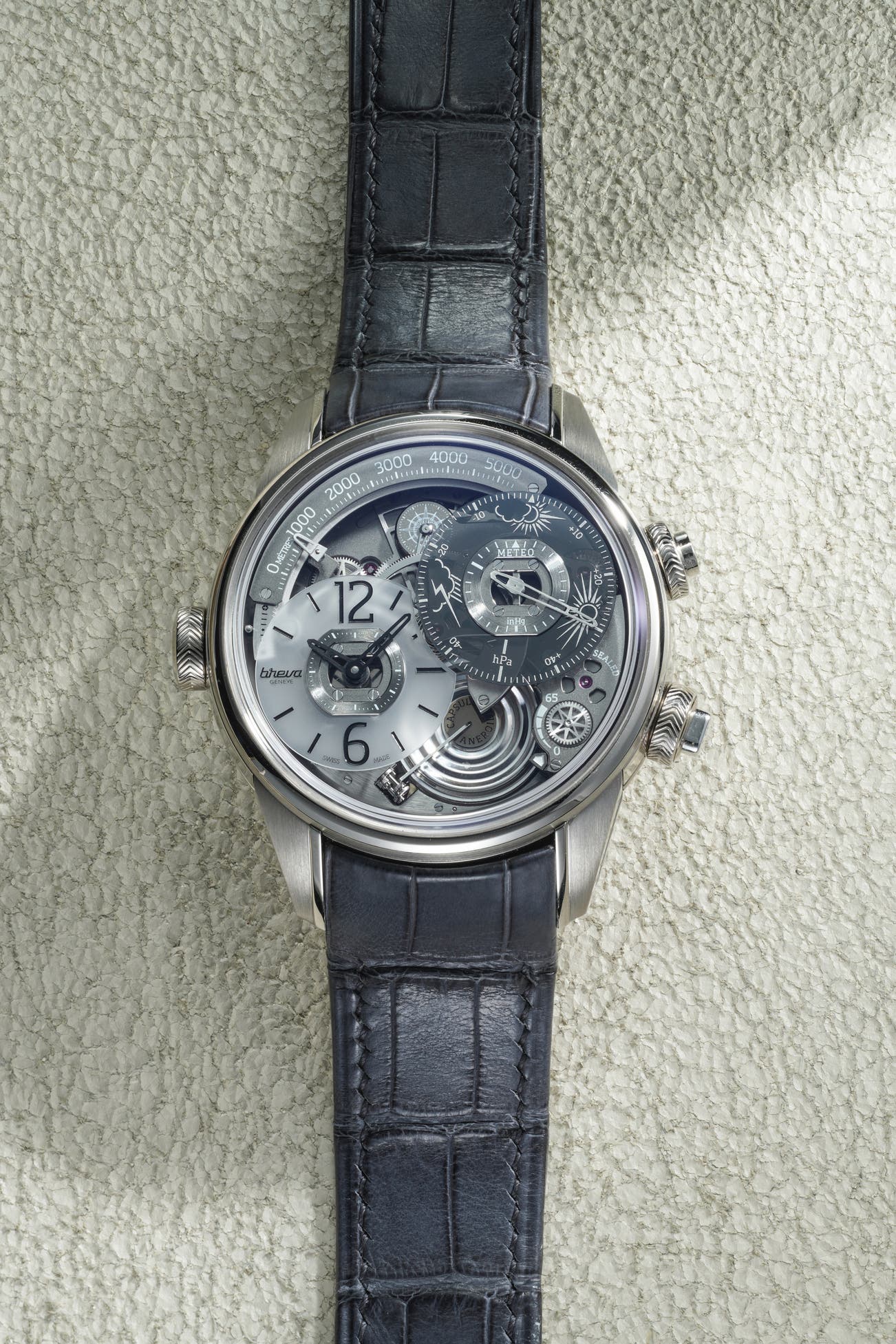 - A true mechanical instrument, the Génie 01 features hours and minutes on a smoky sapphire sub-dial, altitude indicated along the dial perimeter, and barometric pressure with weather forecasting displayed on a dedicated sapphire register. Two specially developed aneroid capsules, visible on the dial, measure air pressure with remarkable sensitivity, translating atmospheric changes into precise altitude and meteorological indications, complemented by a 65-hour power reserve display.
