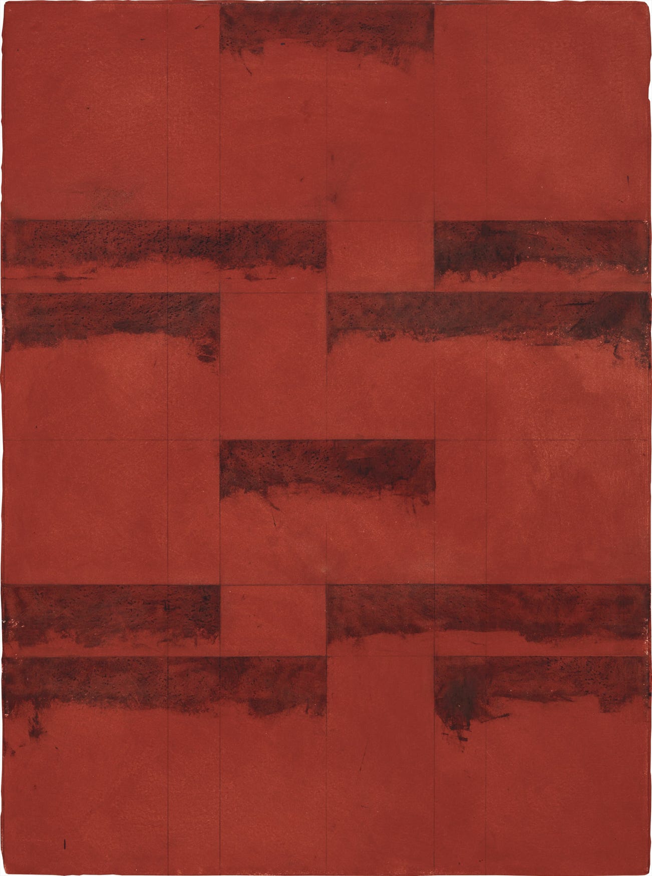 Untitled (#4) was also heavily informed by a life-altering journey, when the artist embarked on a nine-month trip to Thailand, Sri Lanka, and India in late 1983. As with the Cathedral project, this trip had a considerable impact on his art, which was intensely influenced by the Asian aesthetic in the years to follow. In Thailand, Marden began collecting seashells, particularly volutes, and took to drawing their heavily patterned surfaces which reflected the snails’ progression of growth over time. In the present lot, Marden utilizes graphite to draw a grid-like pattern on top of the red painted sheet, alluding to the repeated, linear patterns which he observed on the shells. The domestic scale and meticulous attention to detail in this work are thus emblematic of Marden’s obsession with these tiny volutes, which he studied at great length.
