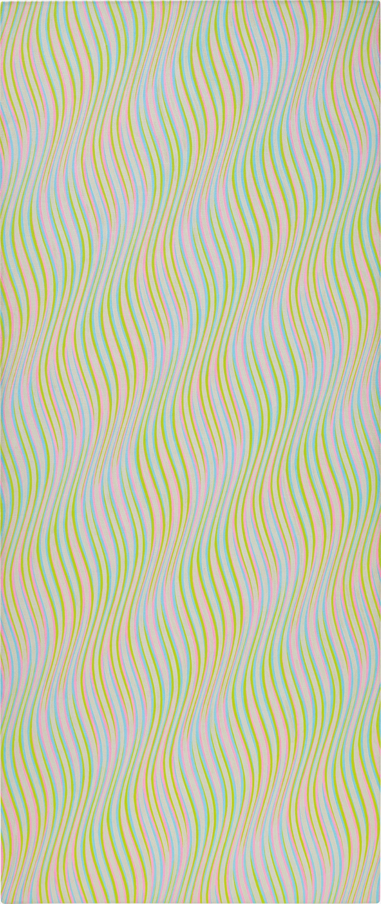 Executed in 1976, Rill is a dazzling paradigm of Bridget Riley’s seminal optic line paintings. Composing a tantalising rhythm scoring the length of the canvas, undulating tones of acidic green ebb and flow, tumbling vertically to infinity. Espousing a quintessentially Op Art aesthetic unanimous with Riley’s idiosyncratic style, Rill recalls the evocative and organic patterns found in nature. Frictions and ruptures glide and drift, building a coherent spatial order, while a shifting sensation of depth results in an ambiguous and wondrously enigmatic pictorial field. Polychromatic and instilled with a heady dynamism, the present work’s rippling and swelling creates an intoxicating visual sensation of psychedelic effect.