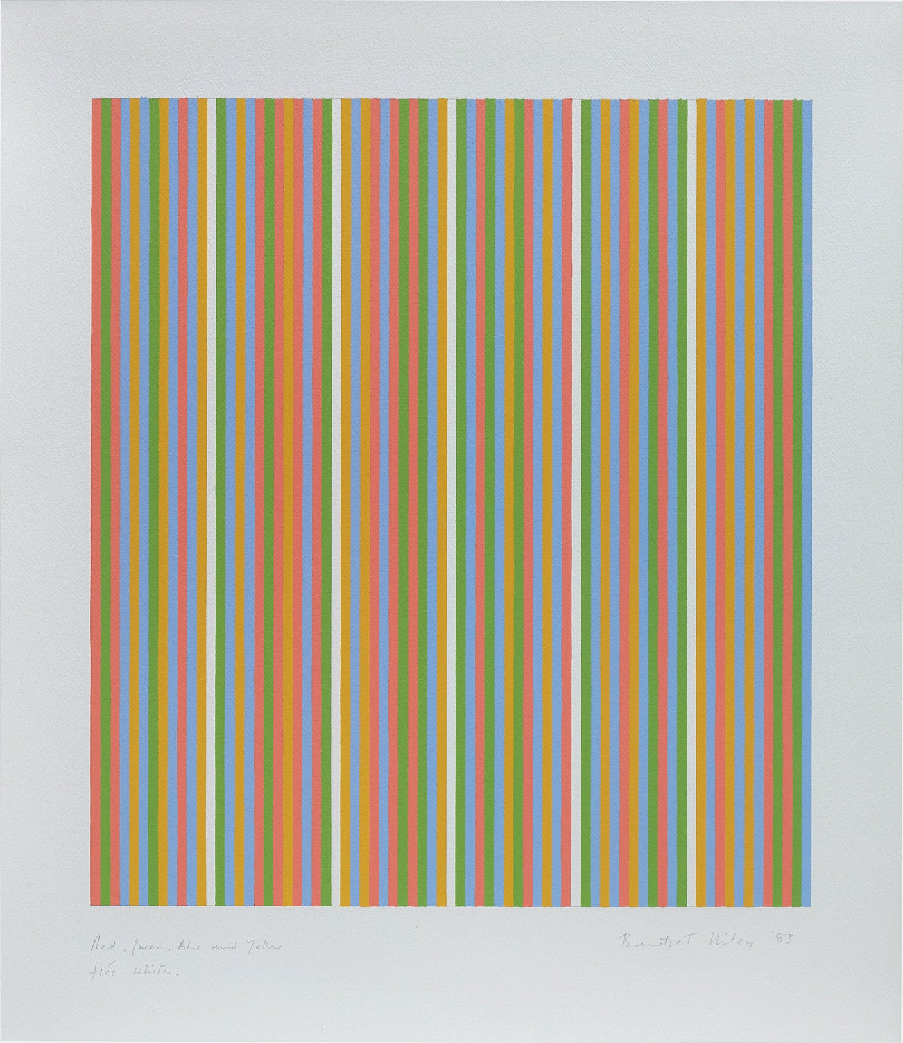 signed, titled and dated 'Bridget Riley "Red, Green, Blue and Yellow, Five Whites" '83' lower edge