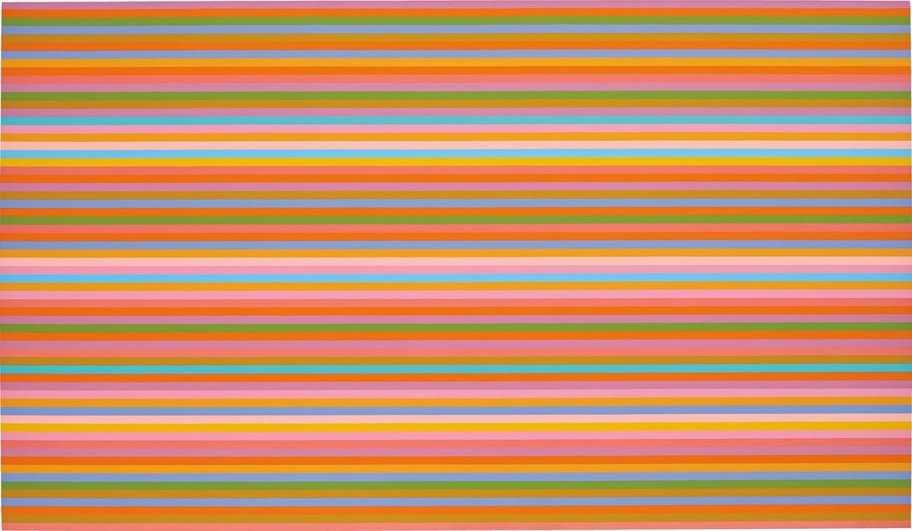At once whimsical and didactic, mischievous and academic, Bridget Riley’s Giocoso, 2017, combines all the defining features of the eponymous opera genre. While the former set of qualities is evident in the painting’s colourful hues and fanciful compositional arrangement, – thus providing a direct echo to the literal definition of giocoso (‘playful’) – the latter characteristics become clear on further inspection, with the realisation that such a picture could only have been realised with extreme precision, skill and labour. ‘Each band has a clear identity’, Riley remarked. ‘Step back and the colours begin to interact, further away still a field of closely modulated harmonies cut by strong contrasts opens up' (Bridget Riley, quoted in ‘At the End of My Pencil’, London Review of Books, vol. 31, no. 19, 8 October 2009, online). An investigation into the mechanisms and effects of colour paired with repeated lines, Giocoso beautifully encapsulates Bridget Riley’s most celebrated painterly idiosyncrasies and thematic drive; it conveys her talent in achieving explosive rhythm whilst paradoxically enabling meditative contemplation.