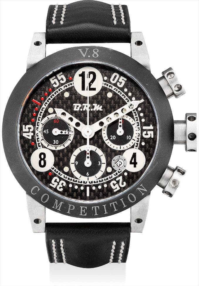 Much inspired by motor sport, the present V8 Competition chronograph wristwatch incorporates many racing car design elements. The bezel features its distinguished checker board pattern and the chronograph pushers are designed to resemble motor engine pistons. The present watch is cased in titanium, making it very practical for daily usage.