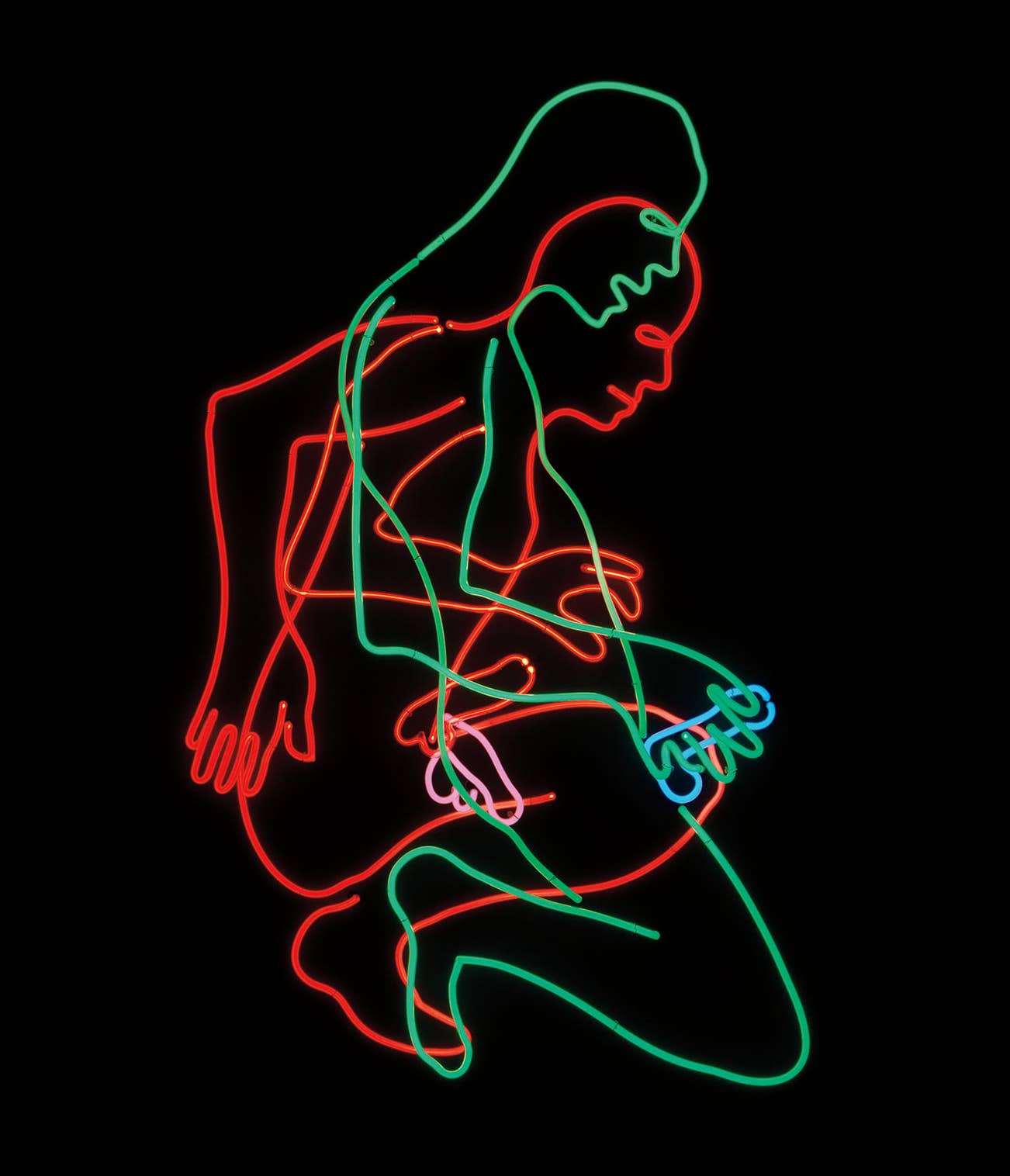 Private impulses and desires are transformed into spectacle as the neon hypnotically flashes in front of the viewer’s eyes like a sign advertising a bar or nightclub. Speaking of the present work, Jean-Charles Masséra observed, “Nauman’s neons do not lead anywhere…The programmed linkage of sequences and the repetition of certain bodily postures deny the event…the existence of desire” (Jean-Charles Masséra, “Dance with the Law”, Bruce Nauman, Baltimore, 2002, pp. 177-184). The human body is disembodied, its action mechanized and repeated ad infinitum without conclusion. As Ute Holl pointed out, “Neon is the epitome of modern-day advertising, offering the allure of a good life that invariably risks proving empty at its core” (Ute Holl, “Frames and Repetition: Neons as Moving Pictures”, Bruce Nauman: Disappearing Acts, exh. cat., The Museum of Modern Art, New York, 2018, p. 170). Nauman plays into this notion, confronting the viewer with a figure caught in a cycle of repetitive actions to the extent that it borders on the absurd and meaningless akin to Beckettian theater.
