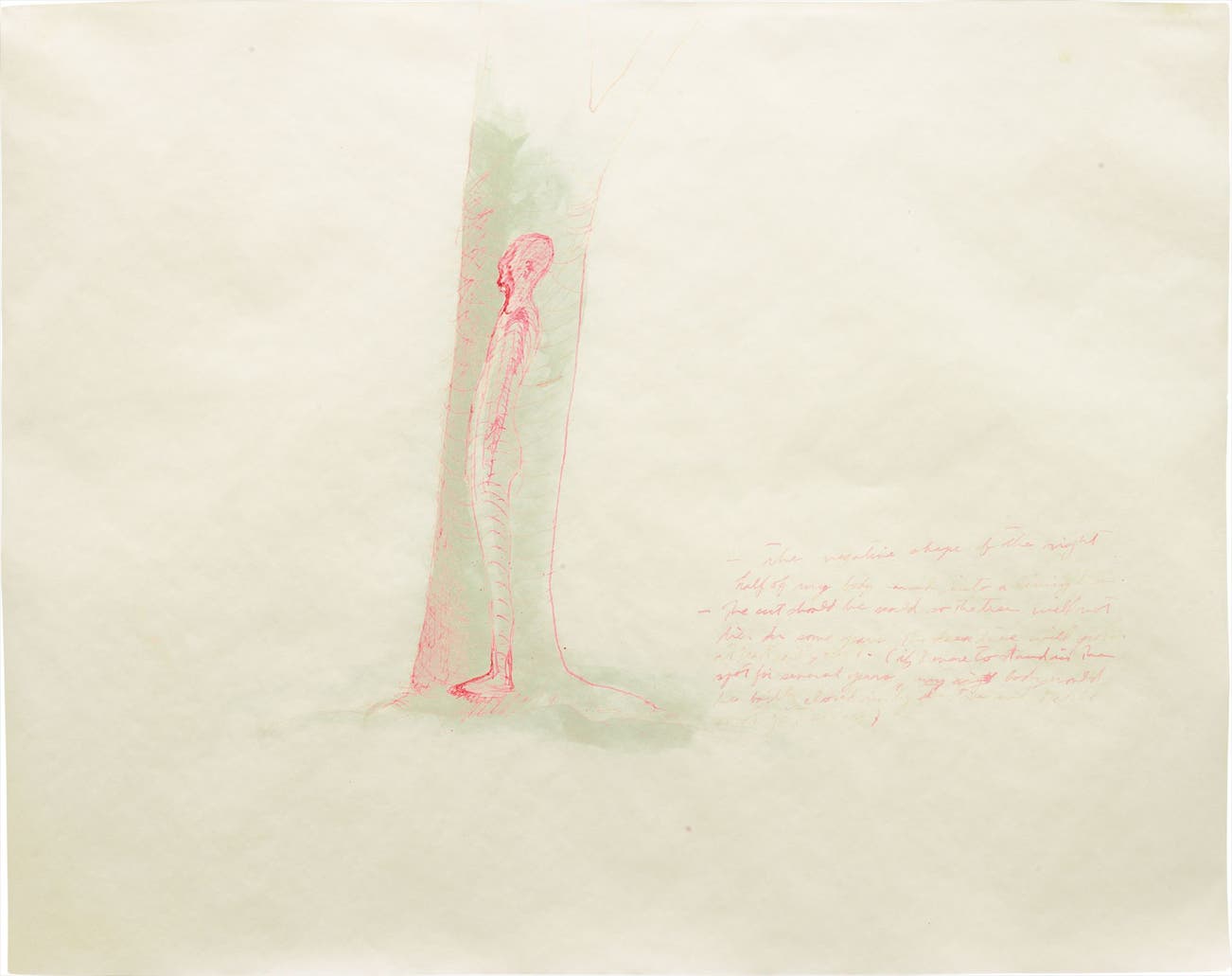 Titled "The negative shape of the right half of my body carved into a living tree" at center.