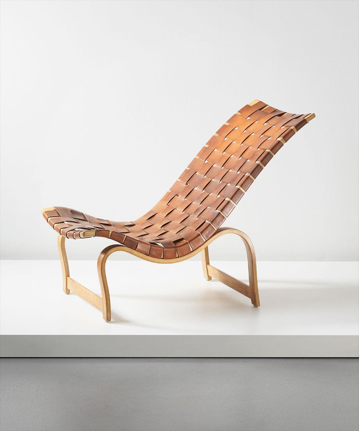 Manufactured by Firma Karl Mathsson, Sweden. Underside of frame with two manufacturer’s paper labels ‘Komp. 1936/Bruno Mathsson/Tillv. 39/Karl Mathsson/Varnamo’ and ‘MADE IN SWEDEN’.