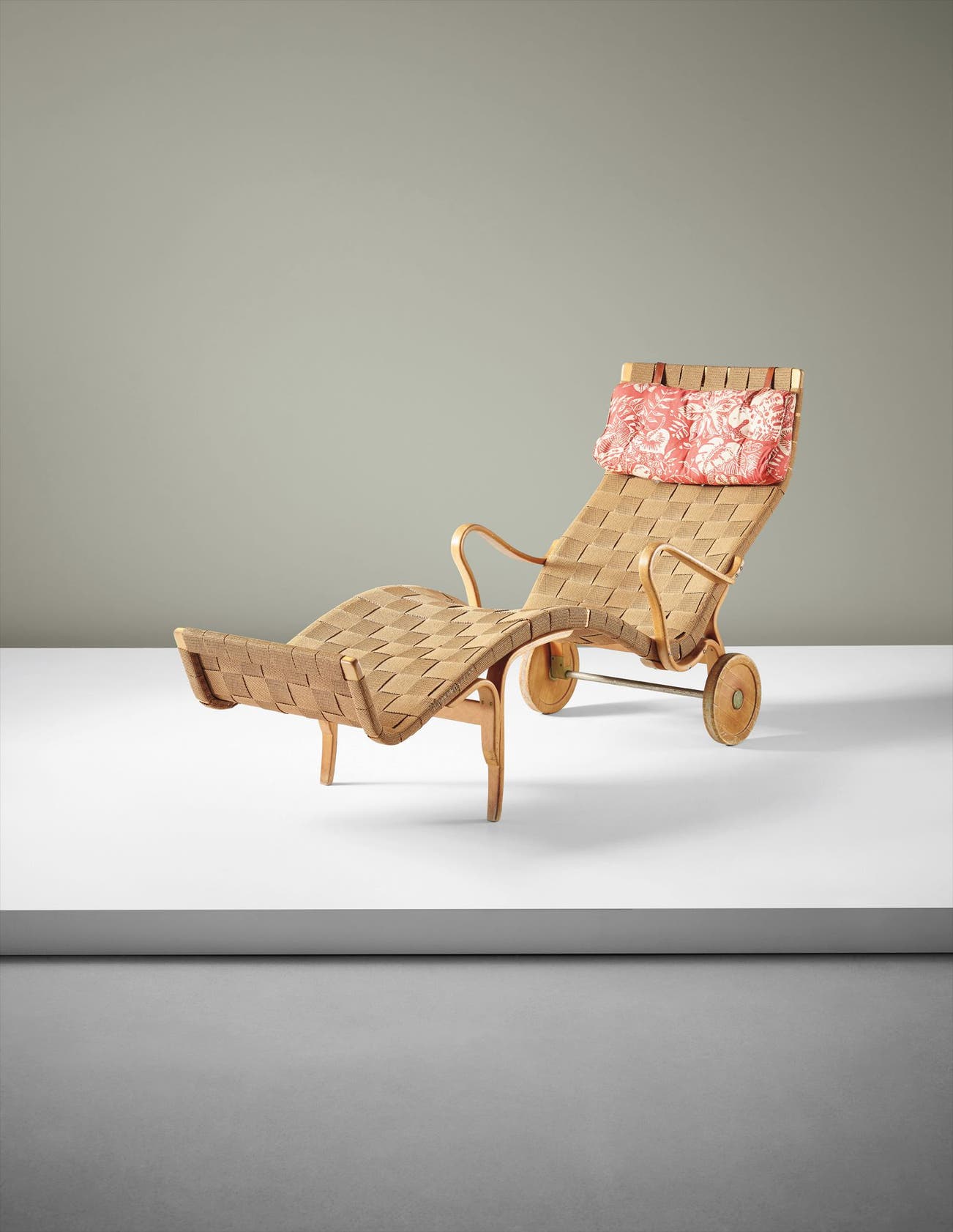 Manufactured by Karl Mathsson, Värnamo, Sweden. Underside branded with manufacturer's logo and BRUNO MATHSSON/DESIGN/MADE IN SWEDEN with manufacturer's stamp FIRMA KARL MATHSSON/MADE IN – VÄRNAMO – SWEDEN. Together with original 'Percy Blad' cushion designed by Arthur Percy (1886-1976) for the Elsa Gullberg Collection, Stockholm, Sweden.