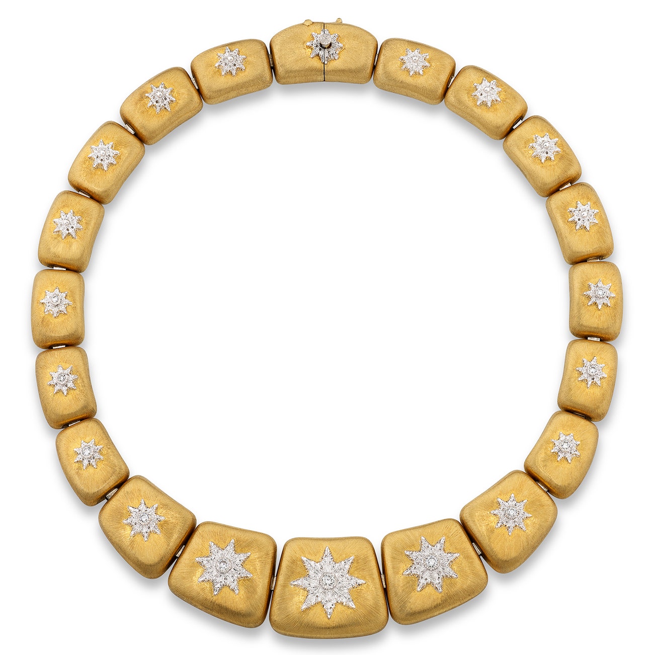 In 1919, Buccellati took over Beltrami and opened a string of boutiques in his own name in Rome, Florence and New York. During his life, he created jewels for the most important collecting families across Europe and papal figures. When Mario passed away in 1965, the business was inherited by his sons Gianmaria and Federico, and today the house continues its tradition of unmistakable design and quality under the management of Andrea Buccellati, Gianmaria's son.