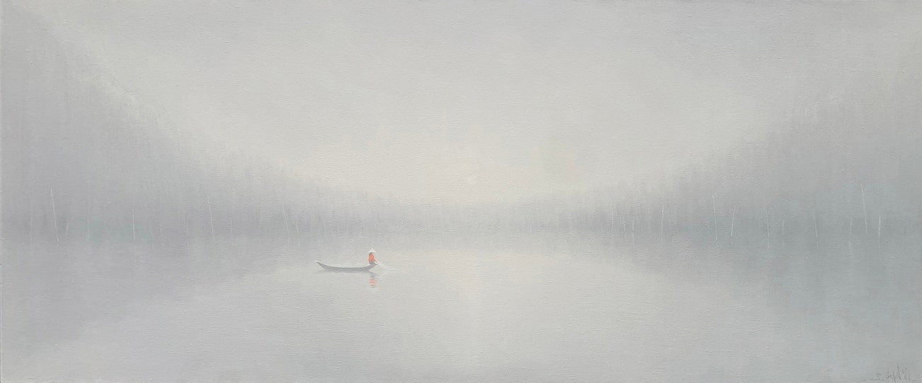 A master of oil painting, Bui Van Hoan is known for his ability to depict light. In this landscape painting, the serene light from the hazy sky is reflected in the calm surface of the river. Like the solitary figure in the scene, we feel enveloped in the tranquil atmosphere created by slight variations of hue and texture. The sense of peace created in this painting reflects the artist’s wider approach to life, which is guided by Thiền Buddhism, a Vietnamese school of Zen Buddhism. Whilst at first glance the viewer encounters monochromatic simplicity, further layers and details slowly reveal themselves to the wandering eye, leading the gaze deeper into the natural landscape.