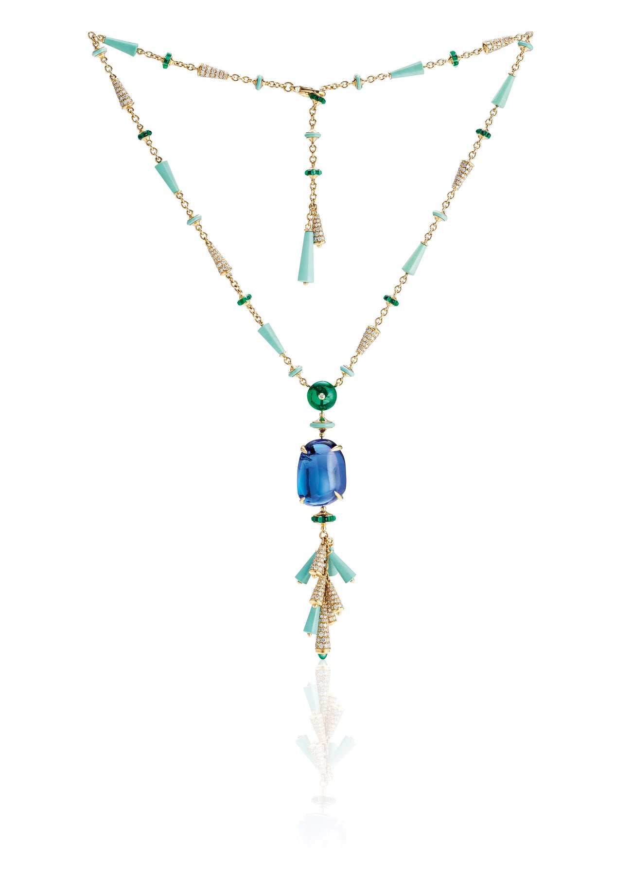 Round brilliant-cut diamonds and fancy-shaped turquoise beads