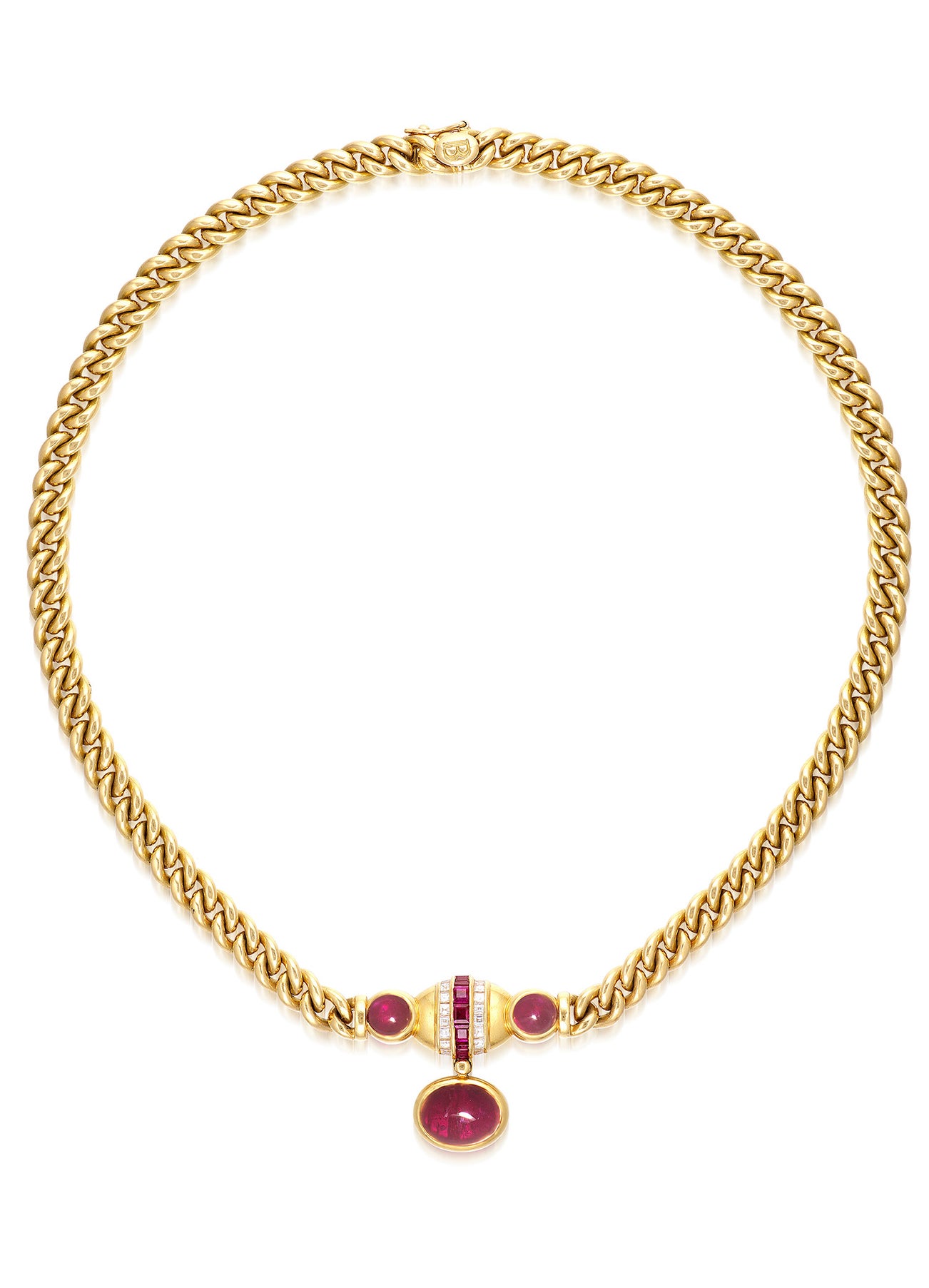 - Five calibre-cut rubies and sixteen calibre-cut diamonds