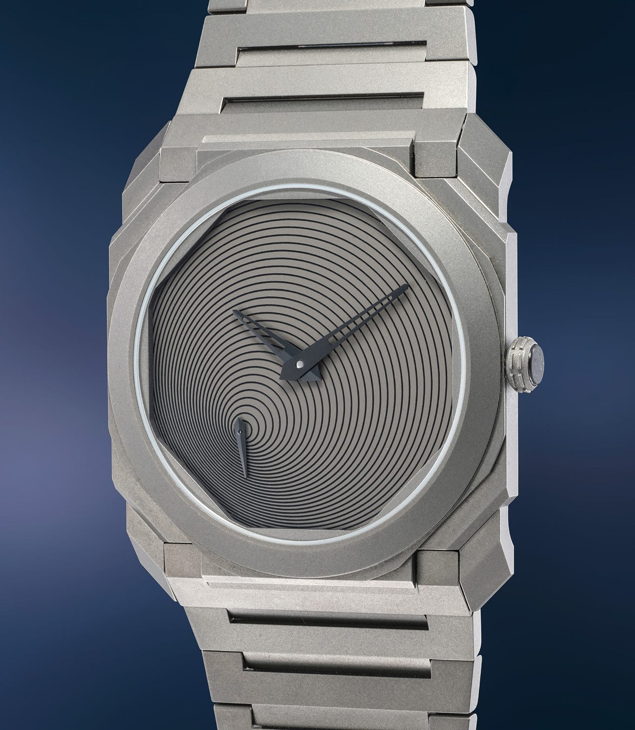 The present example in titanium is designed with pure geometry throughout, with a spiral motif that ripples out from the small seconds hand, the effect remind one of a zen space.