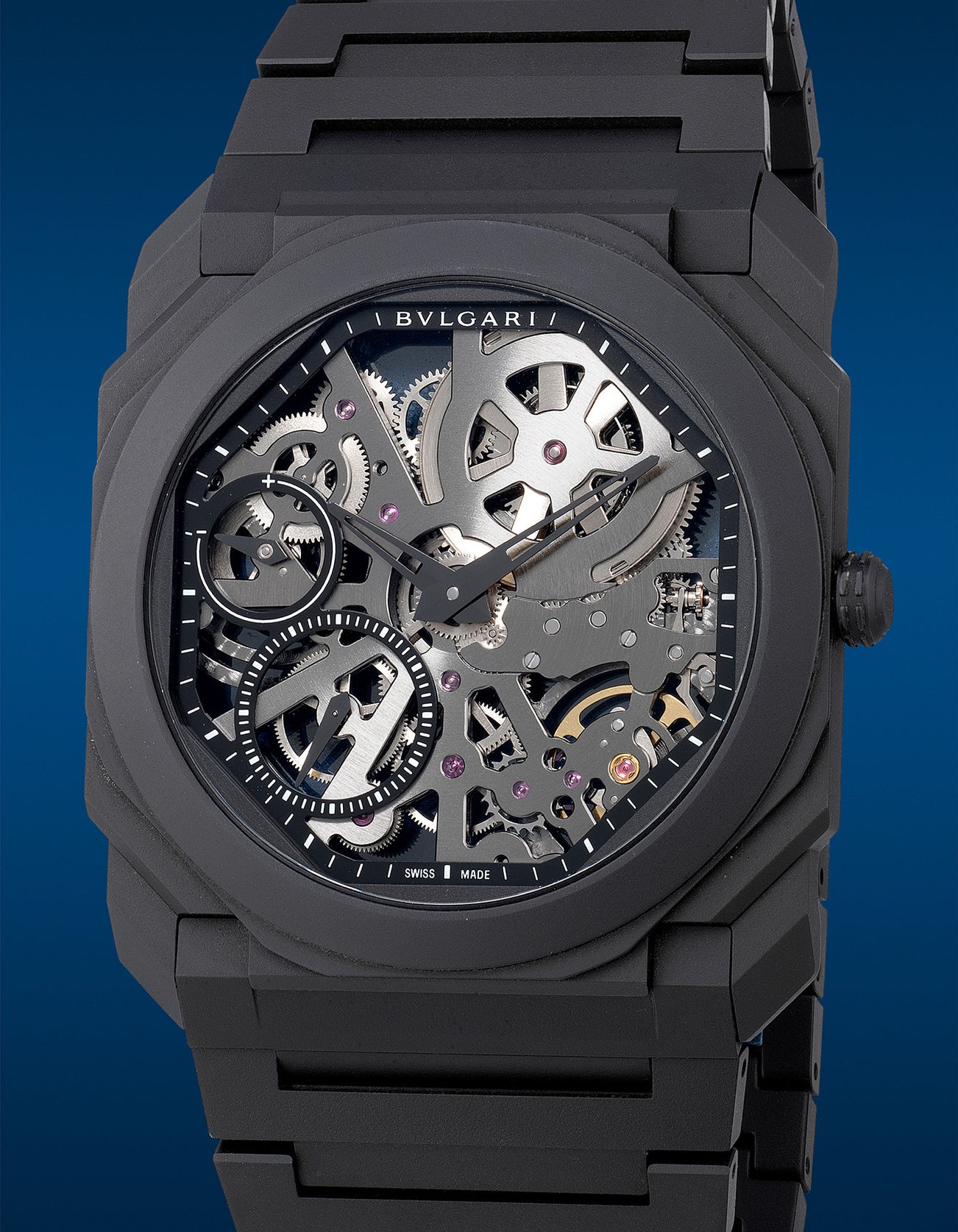 A “like-new” and attractive ultra-slim black ceramic skeletonized wristwatch with small seconds, power reserve indication, bracelet, warranty and presentation box